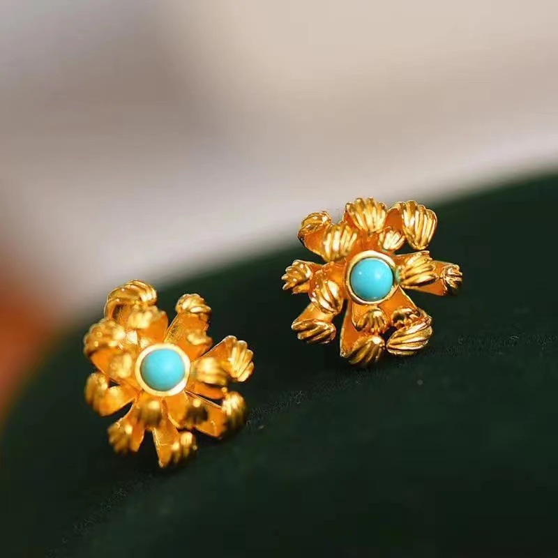 925银镀金花卉绿松石古风国潮宫廷风气质复古女士时尚百搭耳钉