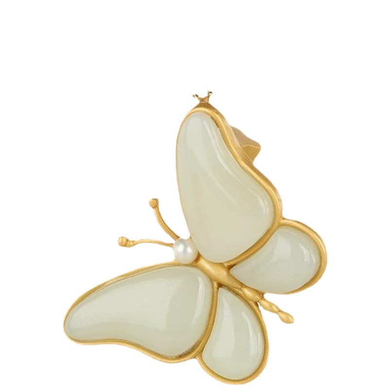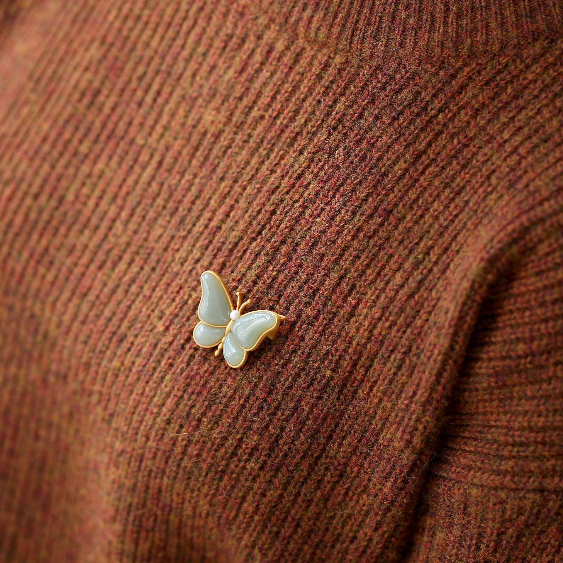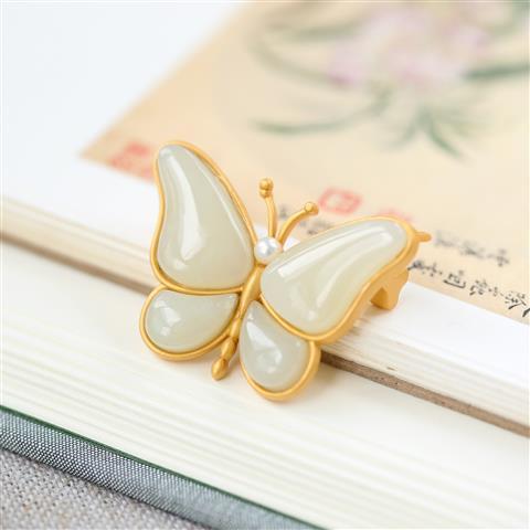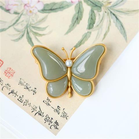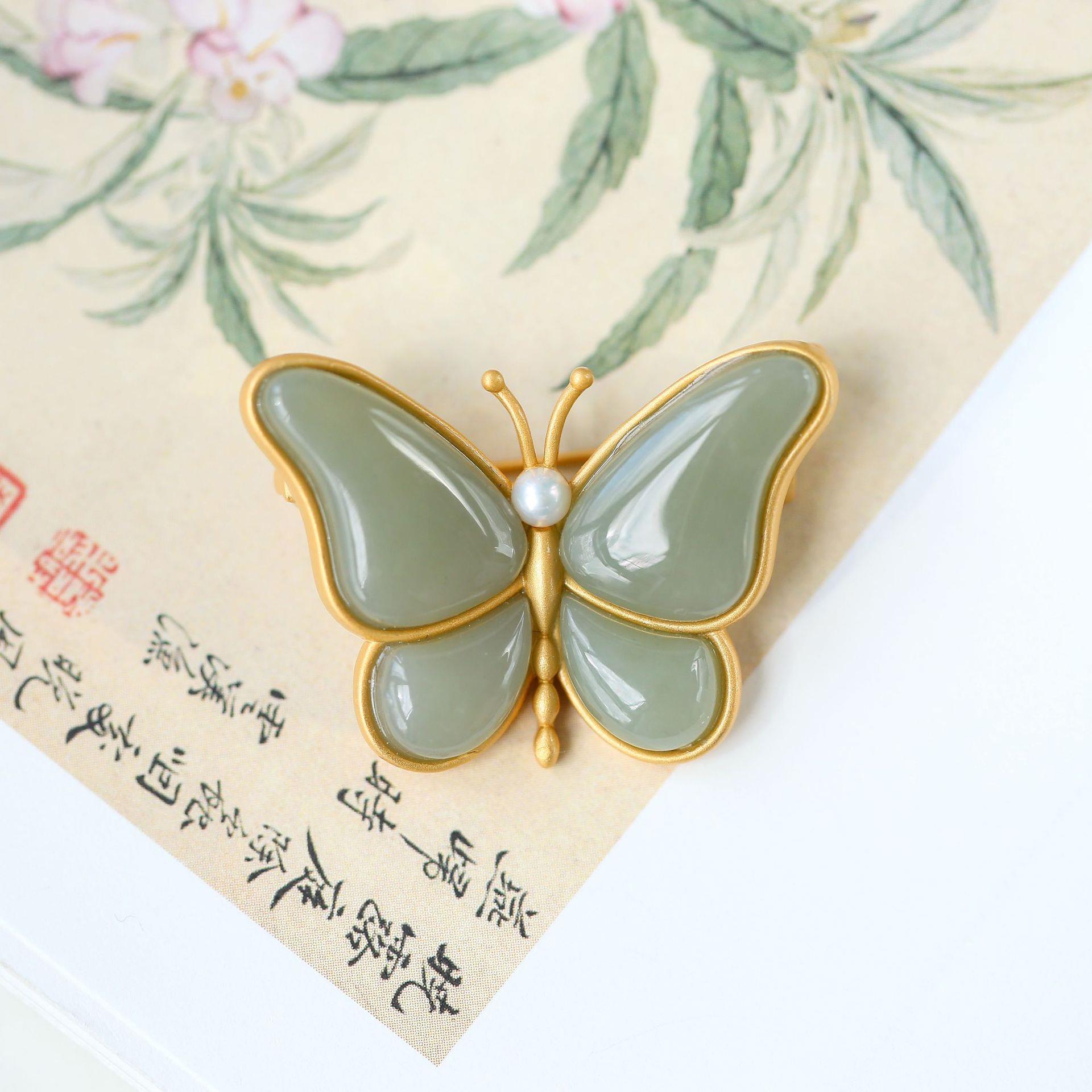 925银鎏金镶嵌和田玉青玉蝴蝶造型胸针高档女新款潮配饰