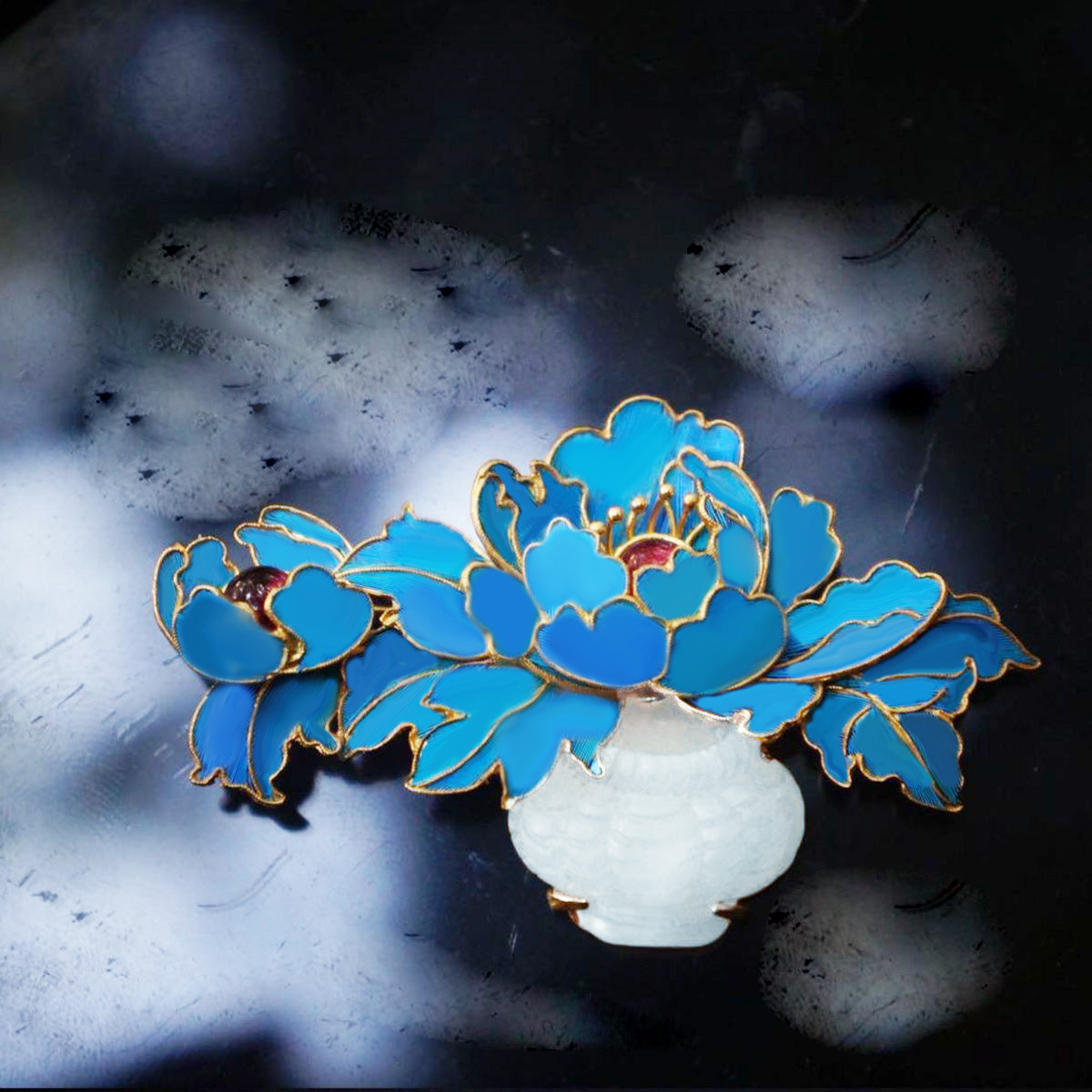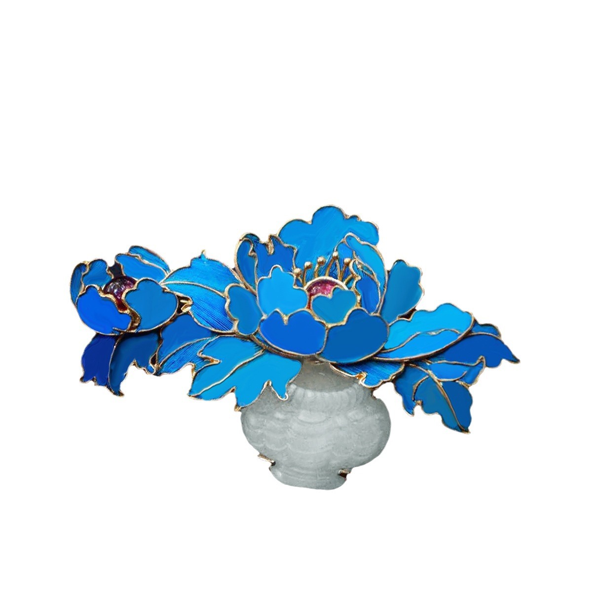 925银鎏金景泰蓝烧蓝嵌白玉花篮花瓶蓝牡丹胸针复古优雅古风旗袍