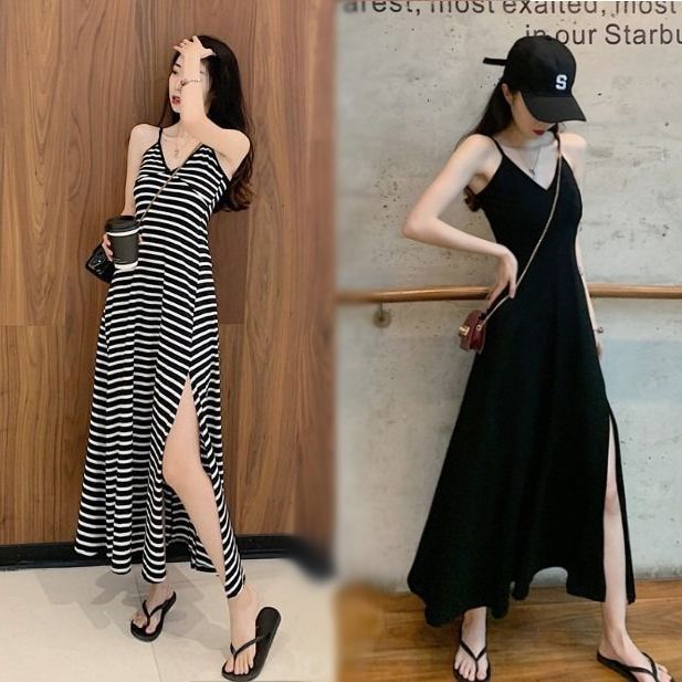 春夏新款V领赫本小黑裙显瘦沙滩裙黑色长裙开叉吊带连衣裙女