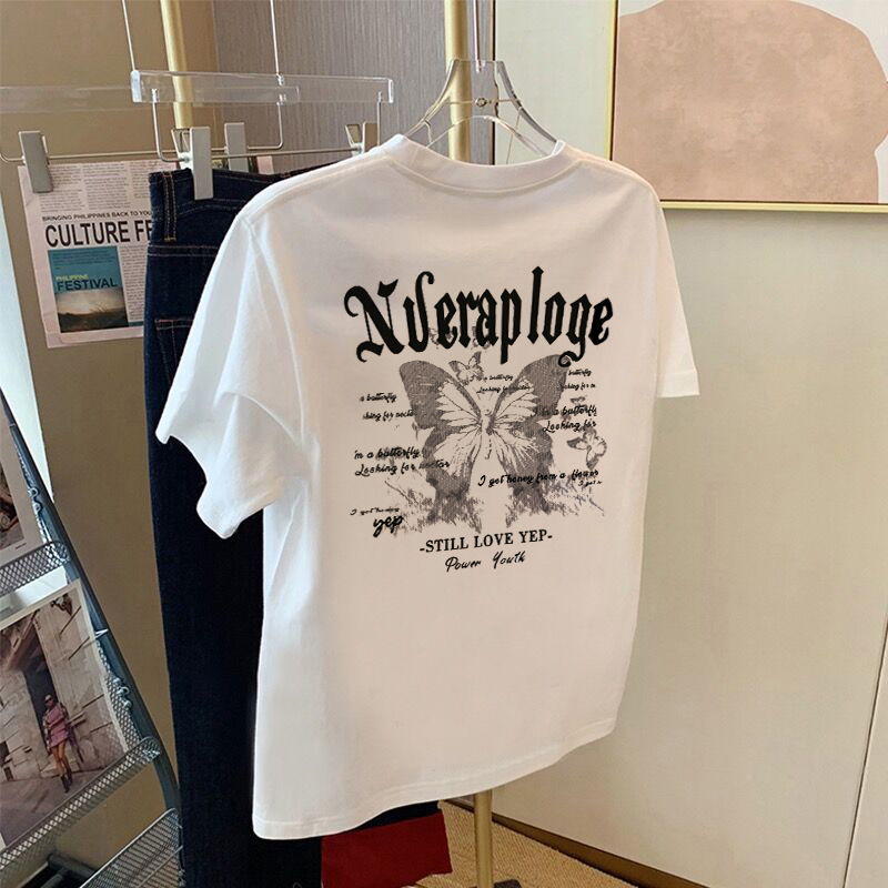 白色纯棉短袖t恤女夏季2025新款蝴蝶印花宽松大码设计感小众上衣