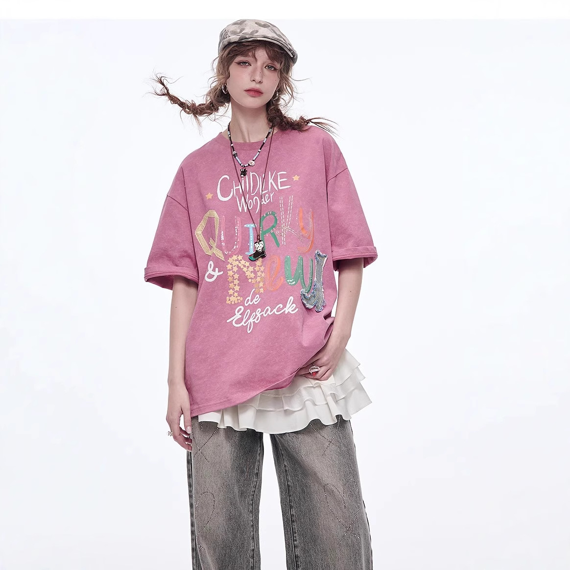 粉色字母印花短袖t恤女2025年春季新款设计感休闲上衣