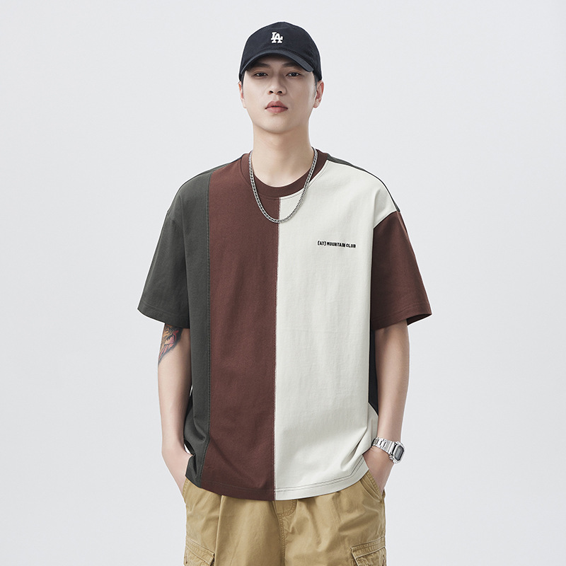 拼接撞色设计短袖男夏季2025新款美式复古250g重磅T恤男纯棉上衣