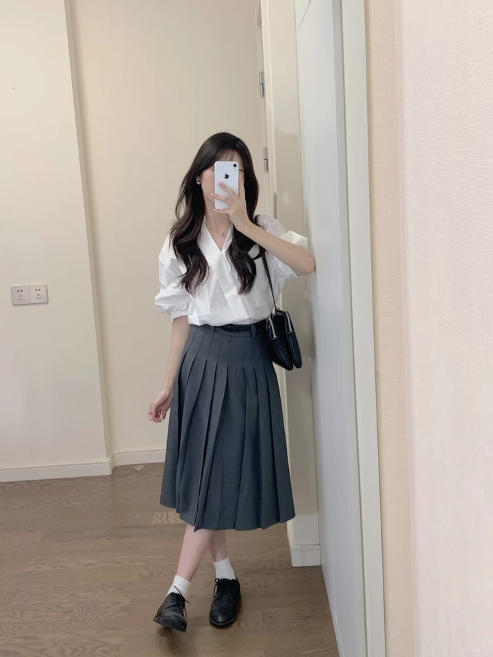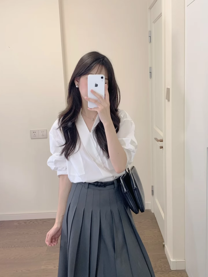 设计感翻领蝴蝶结刺绣T恤女夏小个子褶皱正肩学院风短款别致上衣