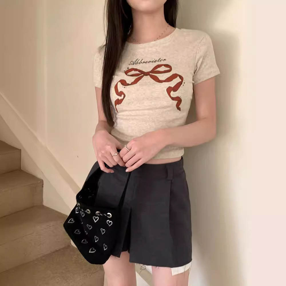 韩系甜辣风蝴蝶结印花T恤修身显瘦短袖内搭女春夏季圆领短款上衣
