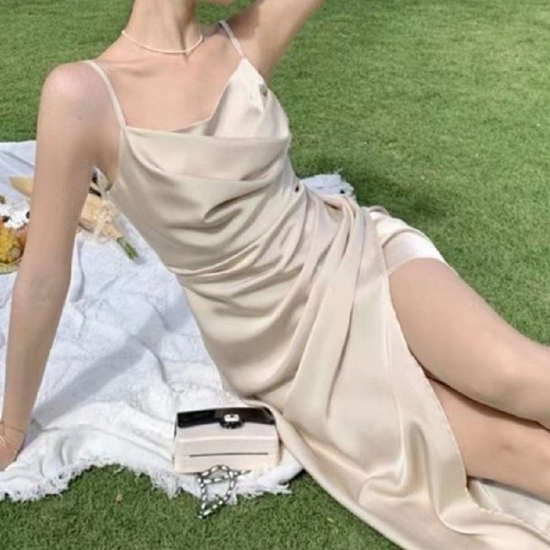法式丝绸缎面港风性感开叉层次皱褶内搭吊带连衣裙晚会礼服裙