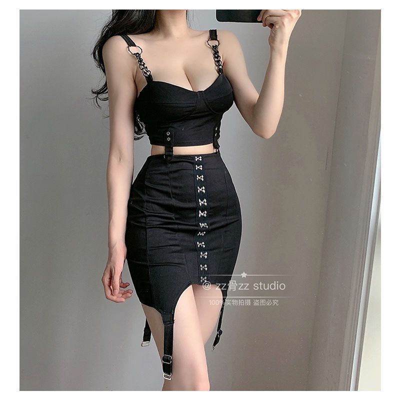 辣妹拼接不规则修身露脐吊带背心女夏季2025新款性感低胸短款上衣