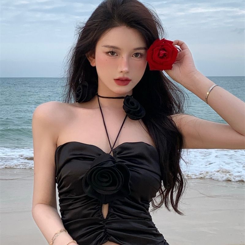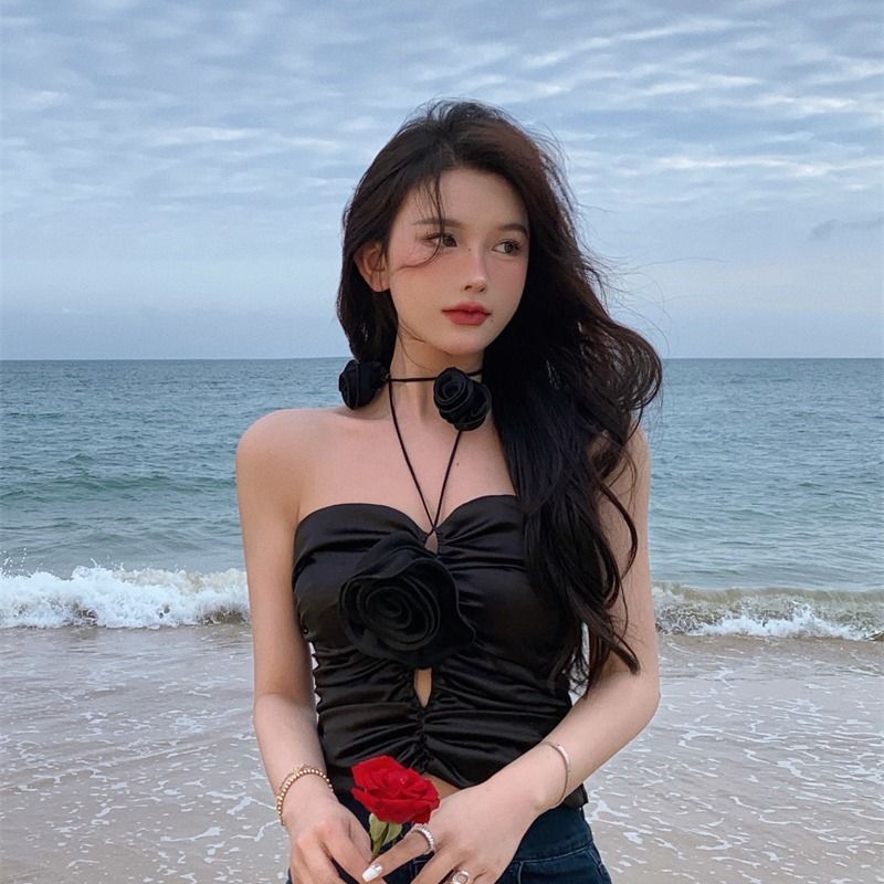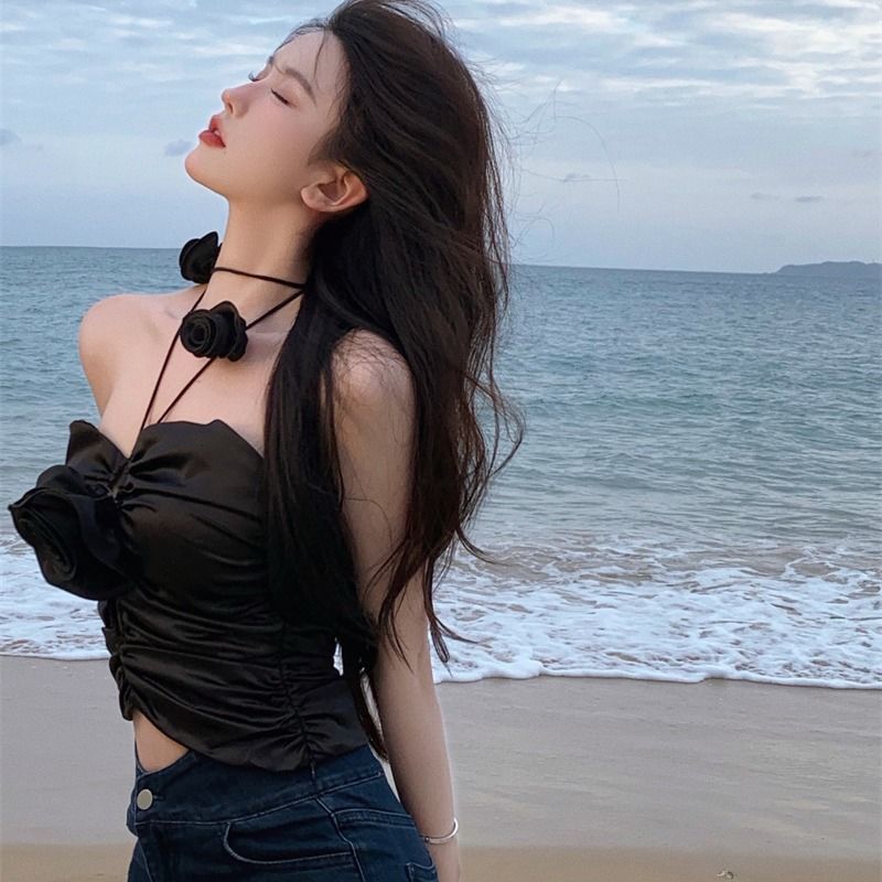 【月销10万】纯欲性感花朵挂颈小吊带背心夏内搭高腰短款辣妹上衣