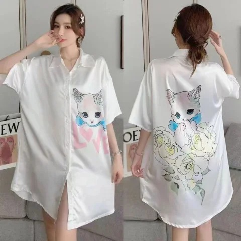夏季新款睡裙女薄款印花短袖衬衫裙中长款冰丝性感开衫家居服女