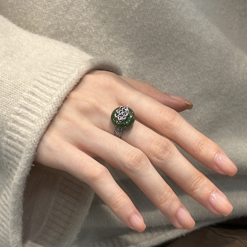 925银复古新中式莲花和田玉平安扣戒指环开口调节小众百搭感
