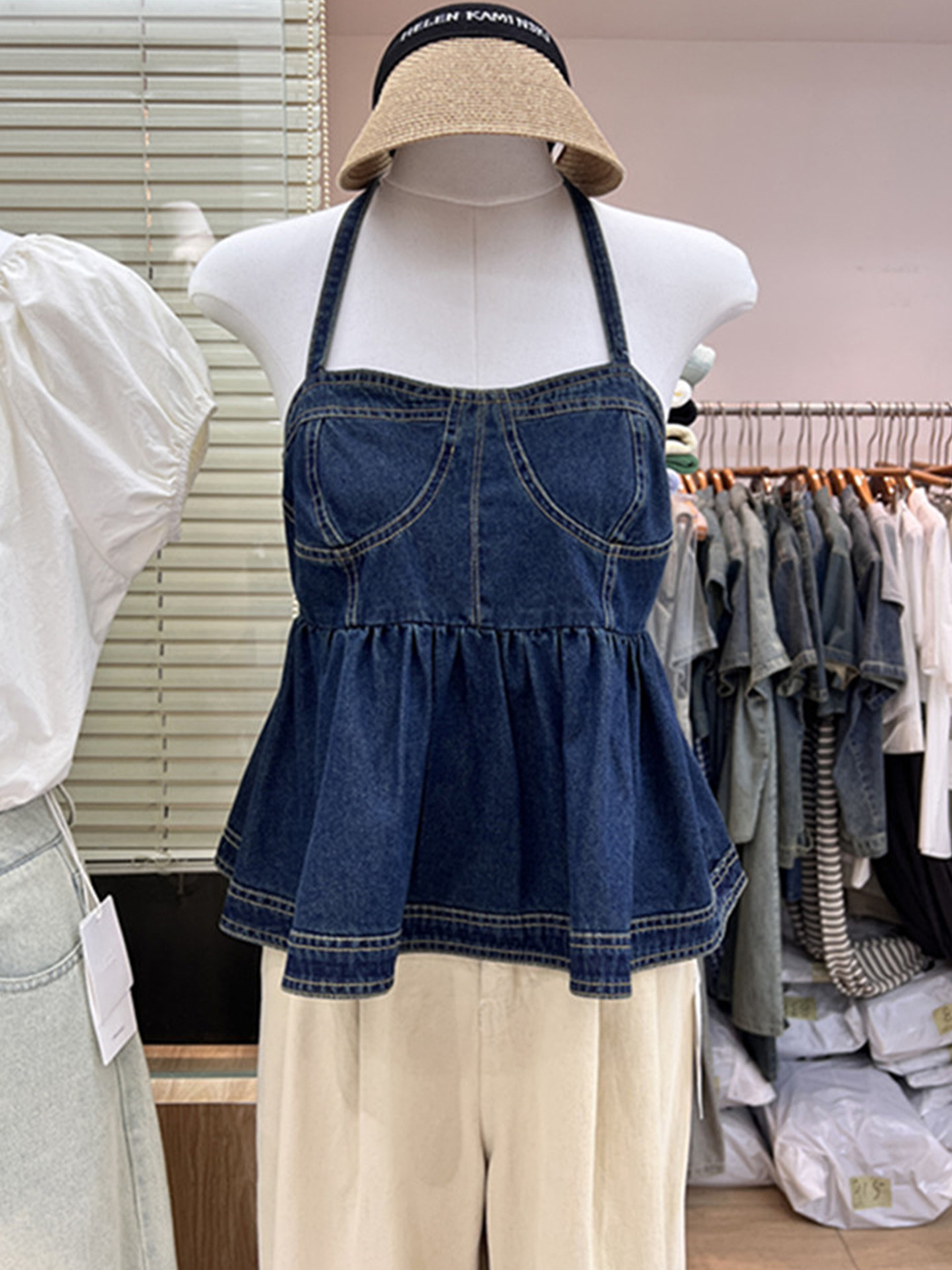 时尚个性夏季新款设计感挂脖裹胸拉链显瘦荷叶边牛仔抹胸女