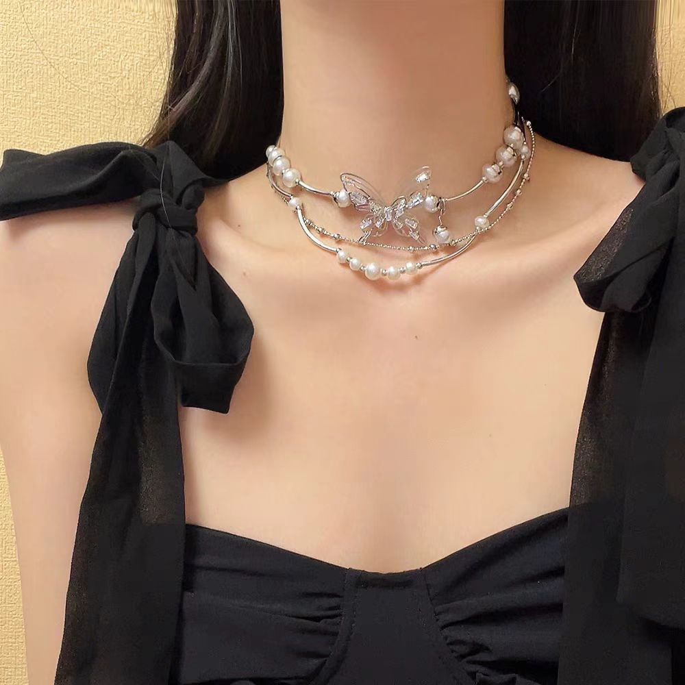 辣妹锆石镂空蝴蝶叠戴珍珠项链女choker轻奢小众高级感锁骨链潮