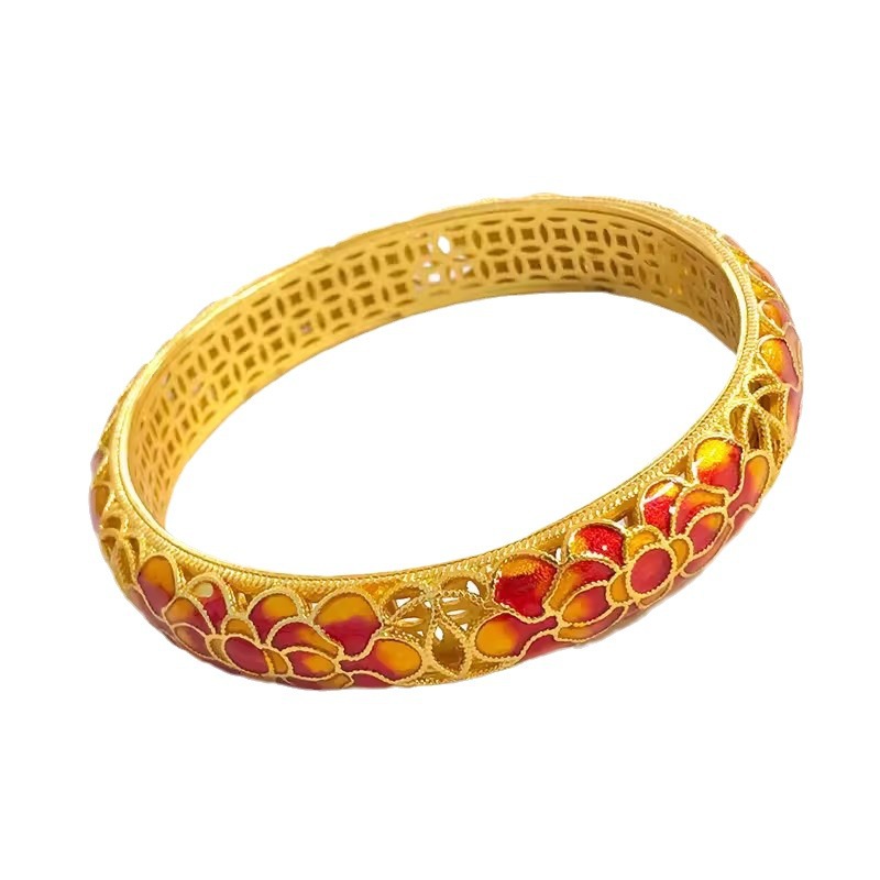 越南沙金珐琅繁花镂空金钱手镯纯银镀金国潮复古烤漆莲花手镯手环