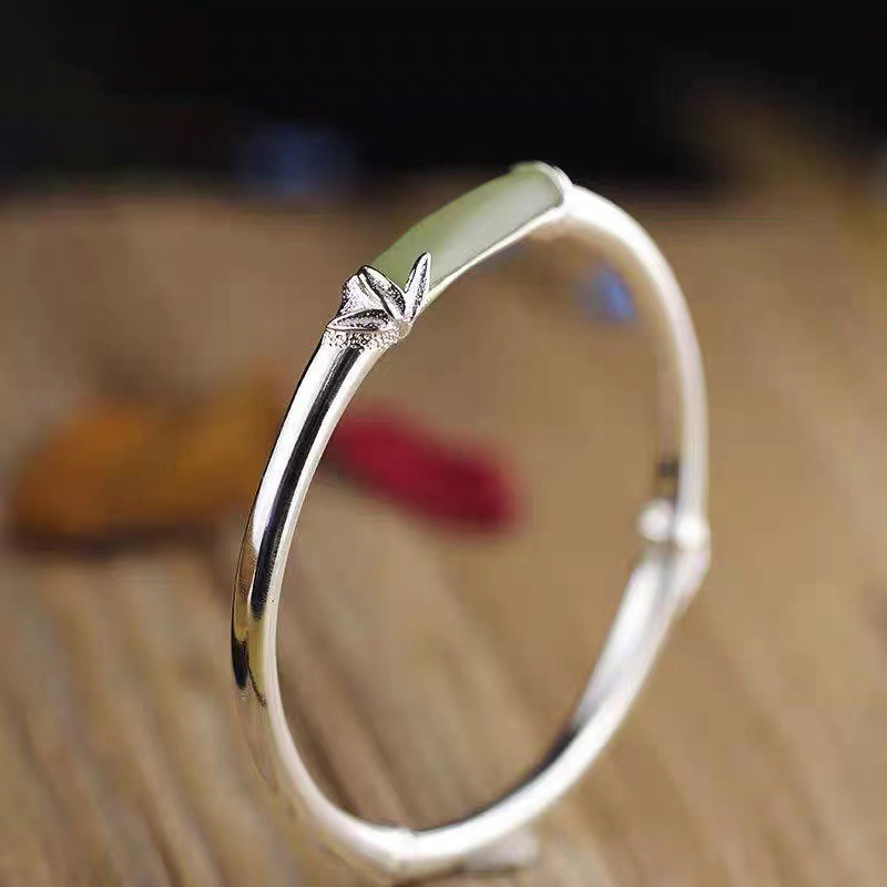 新款竹节手镯女鸭蛋青古风手链镀银手工镶碧玉复古时尚镯子
