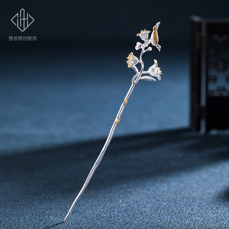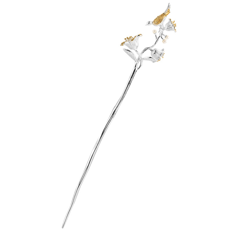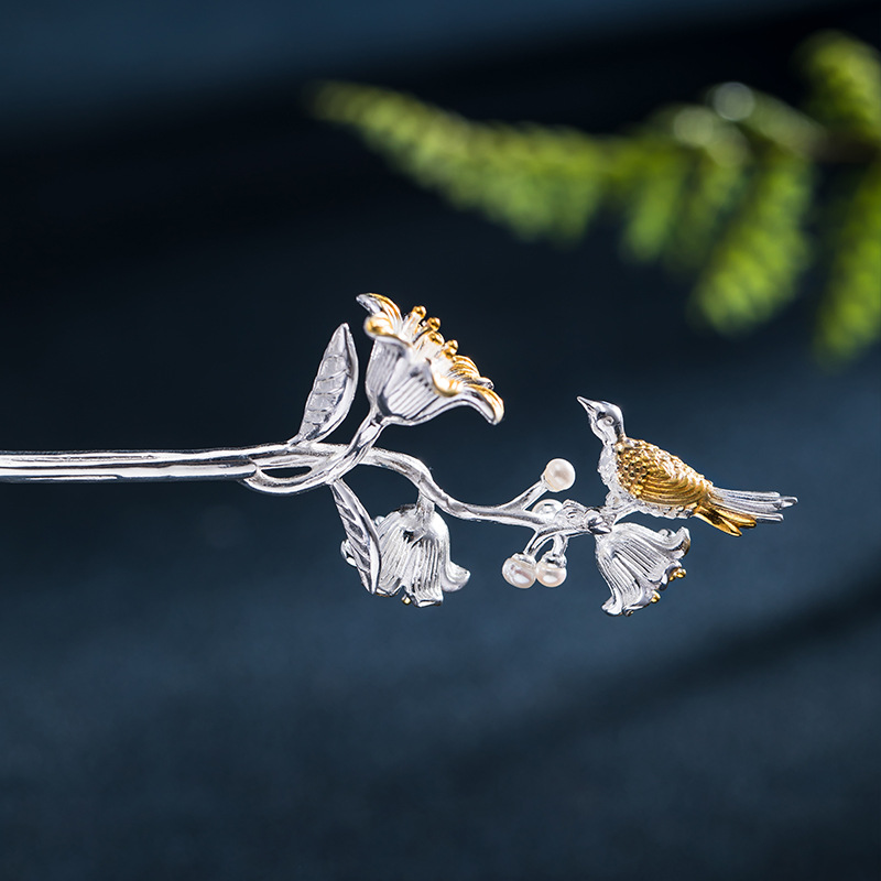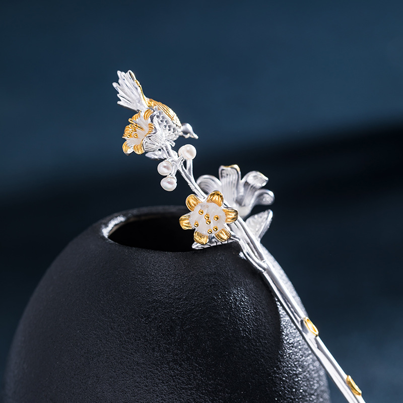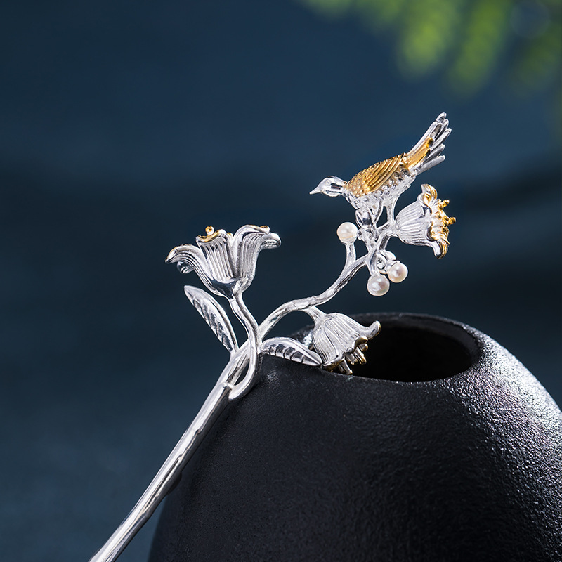 s925纯银喜鹊发簪女古风汉服头饰古代花朵发饰盘发簪子情人节礼物