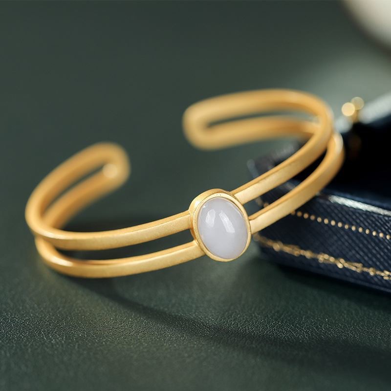 925银镀鎏金白玉真银高档礼品女士开口不掉色手镯手环复古/宫廷