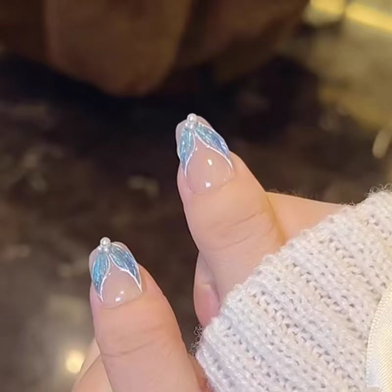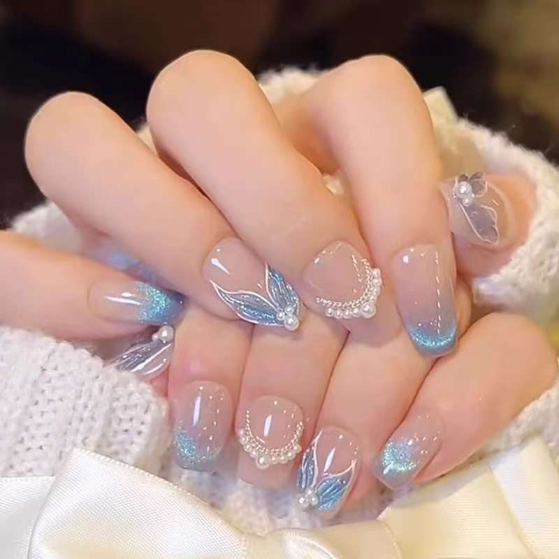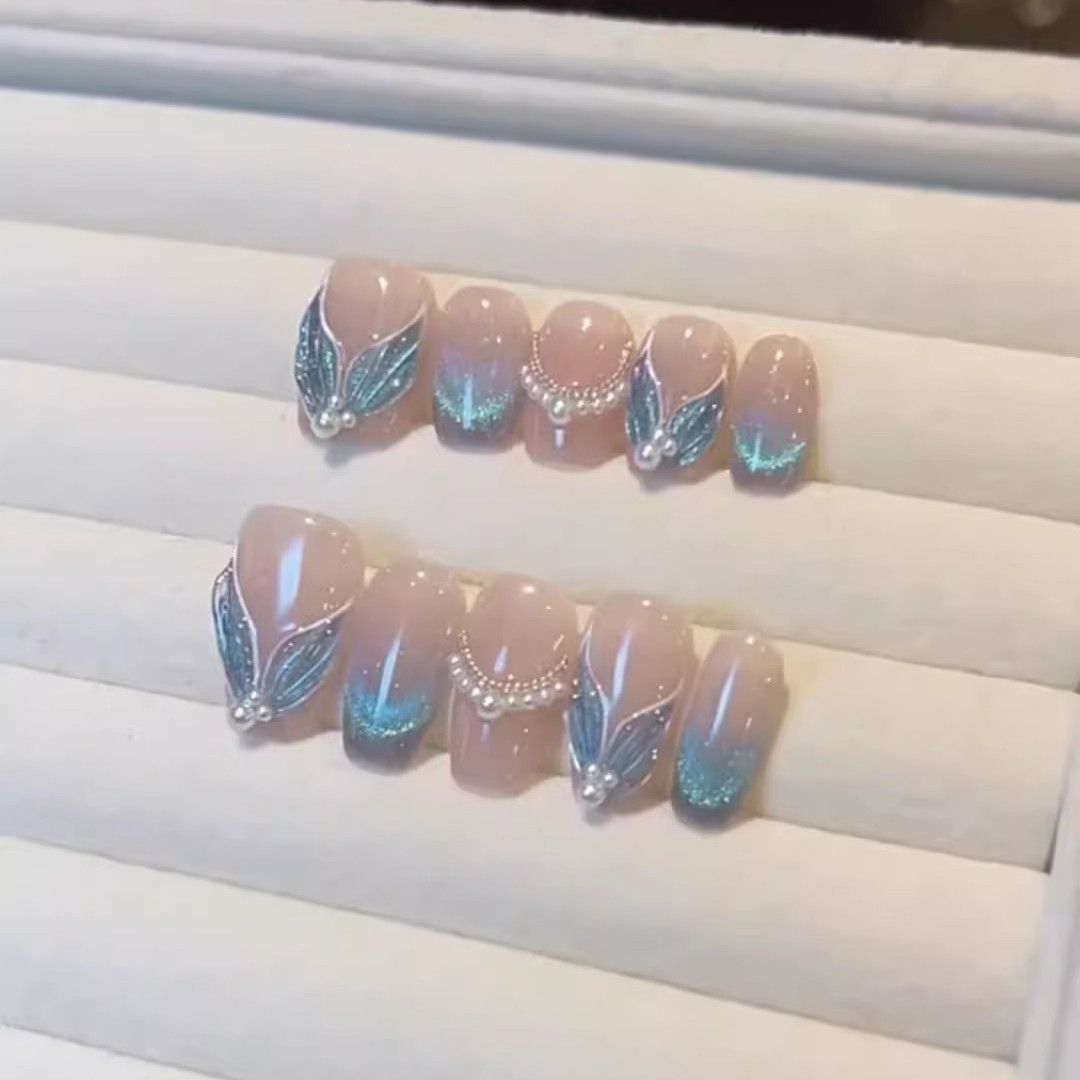 蓝鱼姬纯手工梦幻穿戴甲猫眼人鱼立体成品手绘美甲极光高级感显白