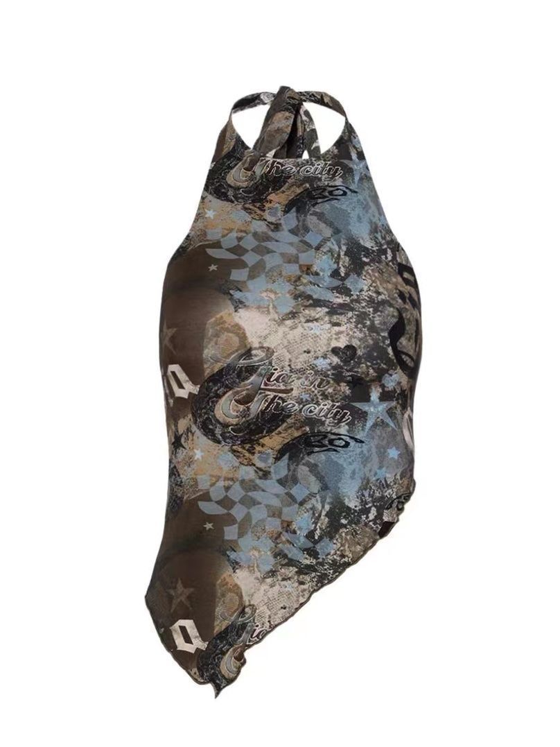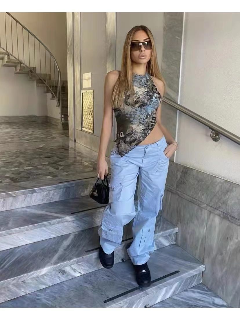 欧美辣妹性感不规则挂脖系带吊带背心设计感露腰修身露脐上衣isn