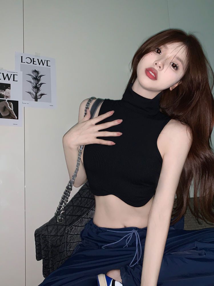 性感露脐辣妹短款无袖吊带女夏季半高领紧身性感上衣