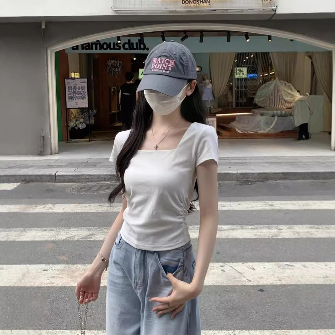 夏季新款白色T恤chic高级感方领卡腰褶皱正肩短袖女纯欲上衣