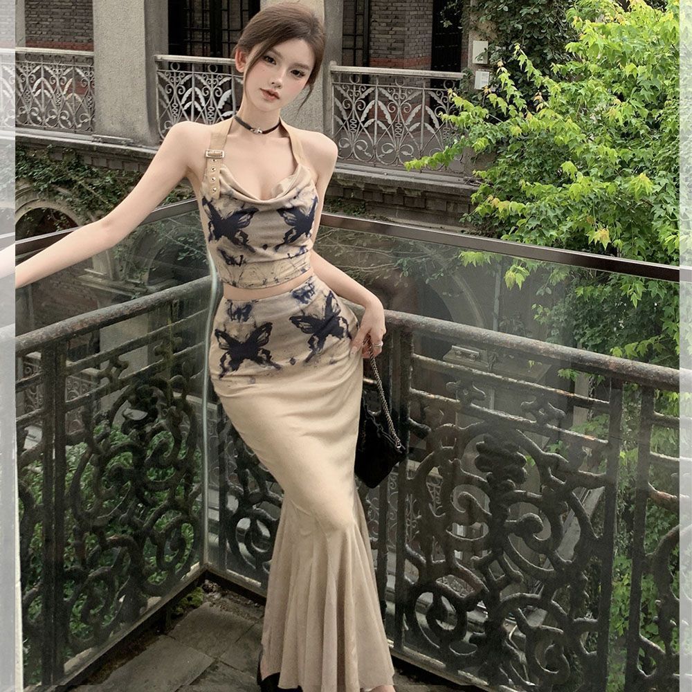 【月销10万】复古蝴蝶水墨抹胸上衣挂脖吊带背心纯欲新款修身内搭