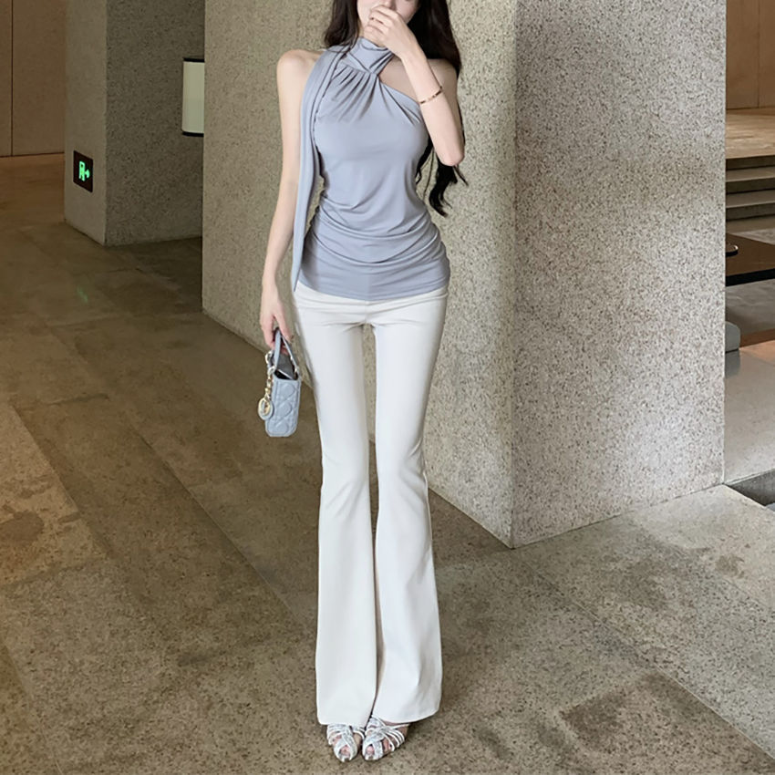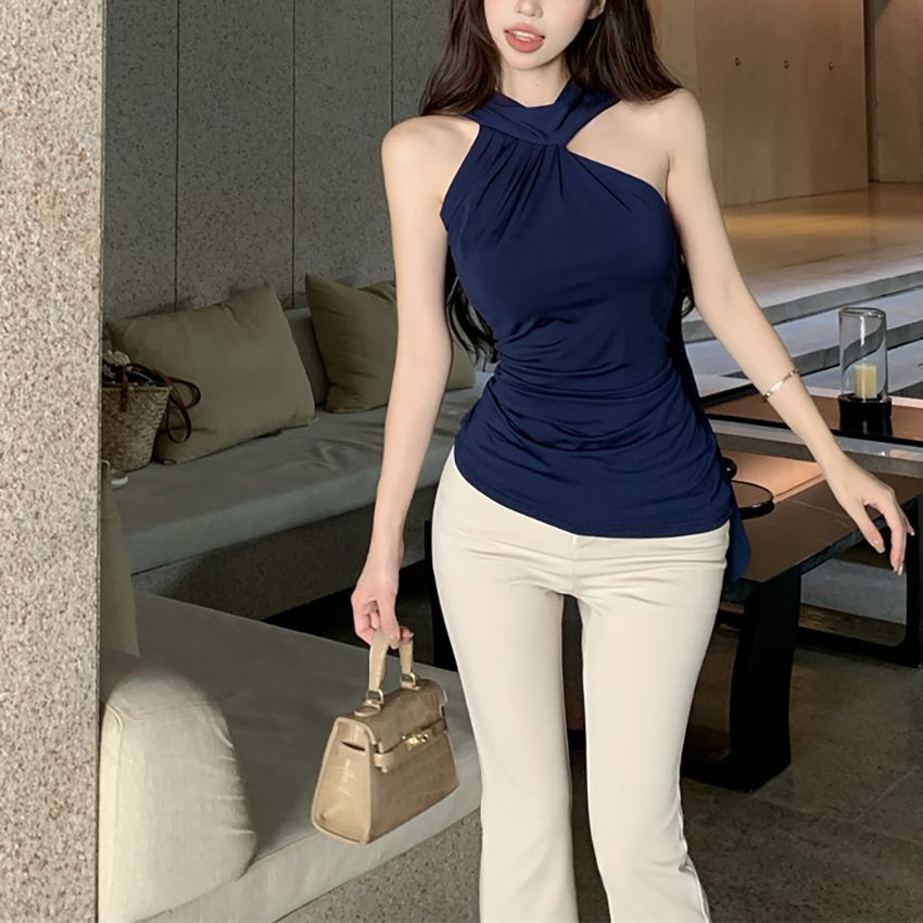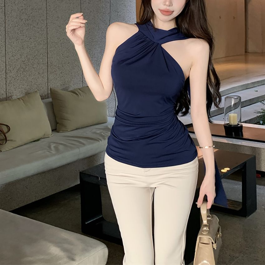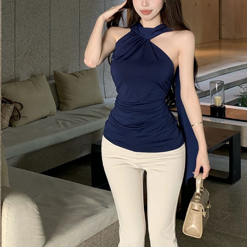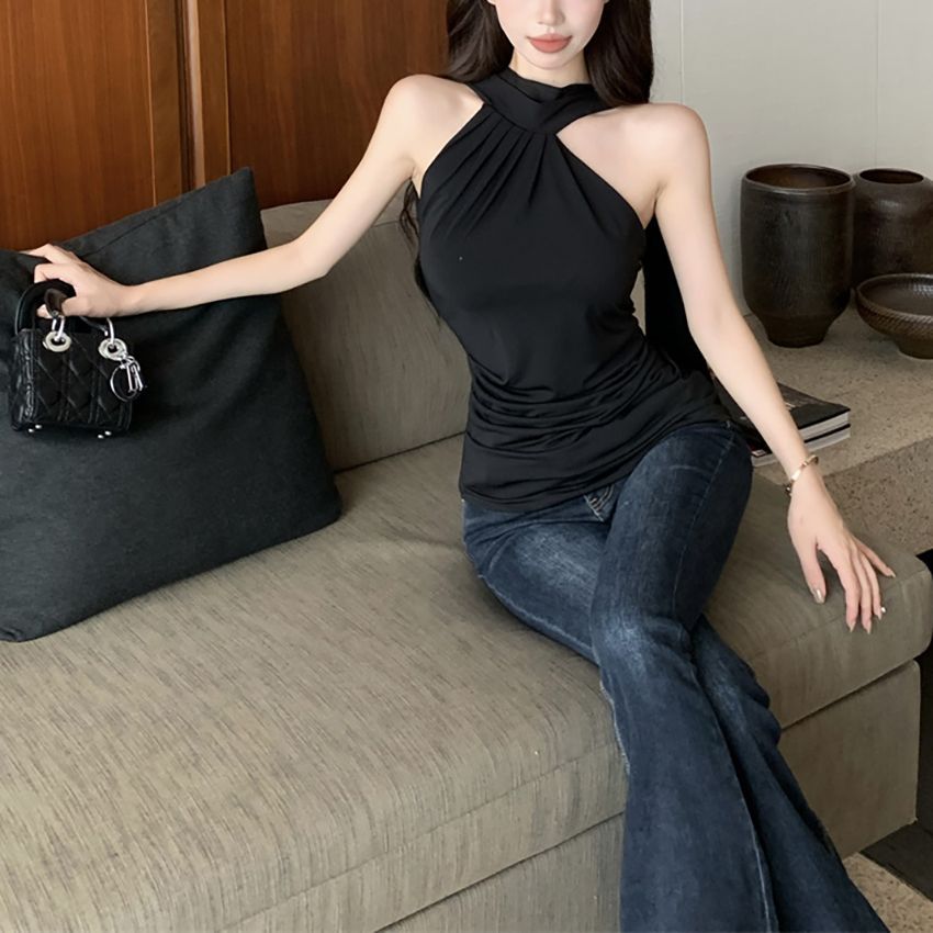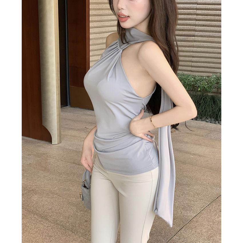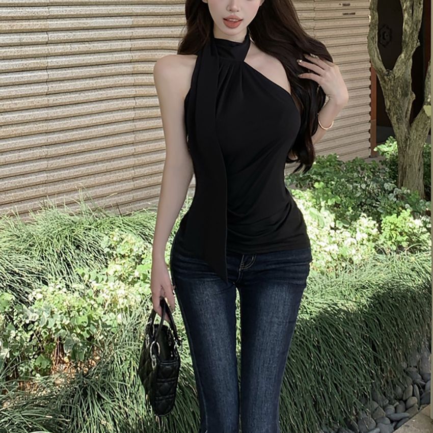 气质飘带挂脖修身吊带小背心夏季显瘦内搭无袖黑色辣妹上衣东南亚