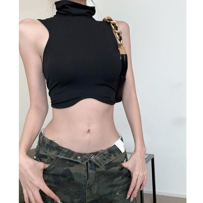 辣妹设计感女夏季港风小众不规则纯欲短款露脐背心高领修身上衣女
