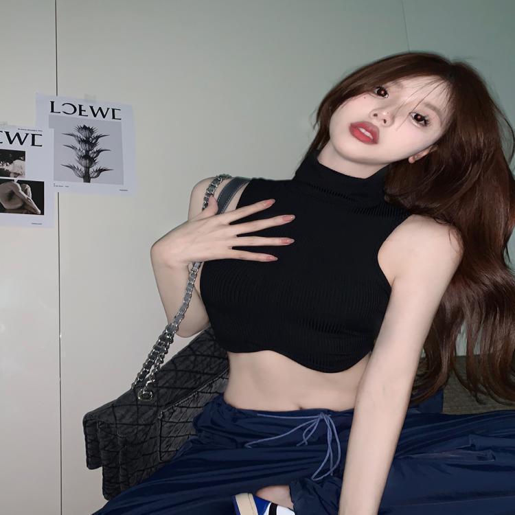 辣妹女夏季小众不规则纯欲短款露脐背心高领修身上衣