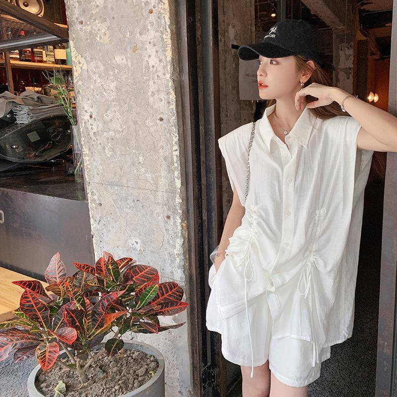 实拍抽褶系带设计单排扣宽松休闲polo领白衬衫显瘦高腰短裤套装女