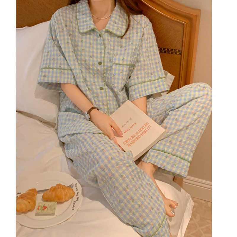 睡衣女夏季短袖长裤韩版简约清新格子碎花休闲学生家居服两件套装