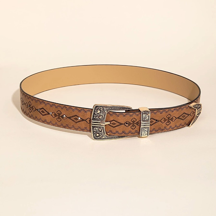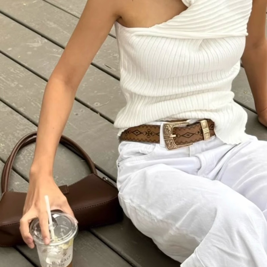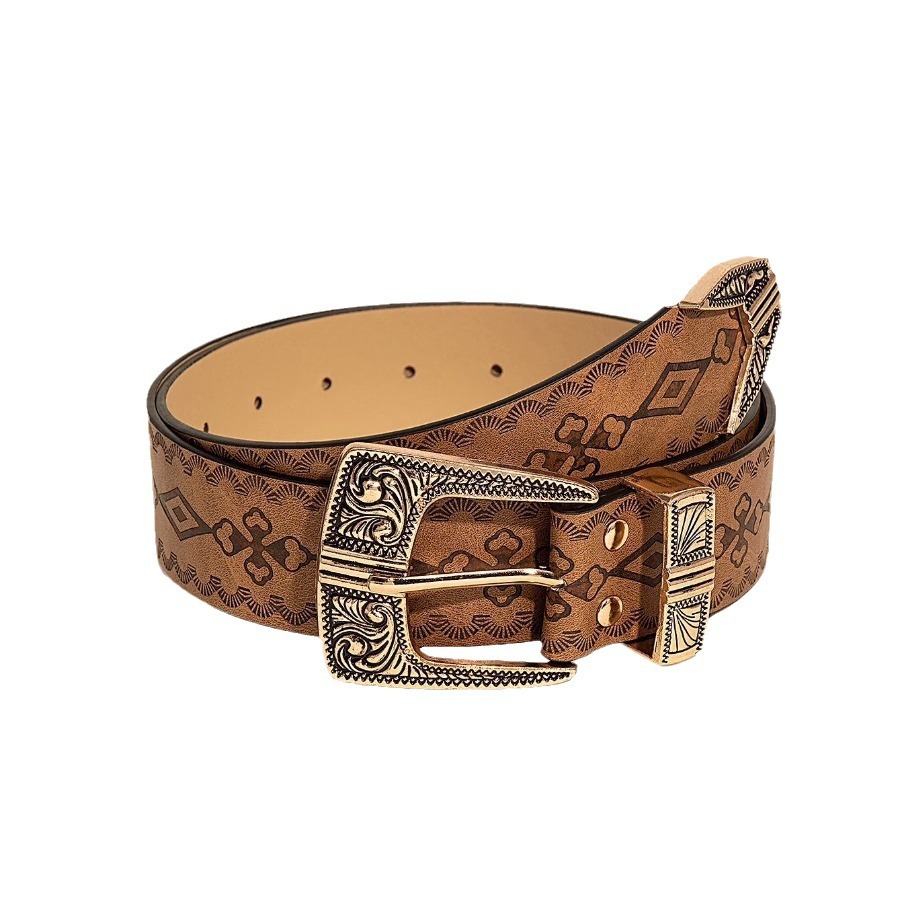 欧美风辣妹日常棕色纹理小众针扣腰带特别印花图案批皮带男女通用