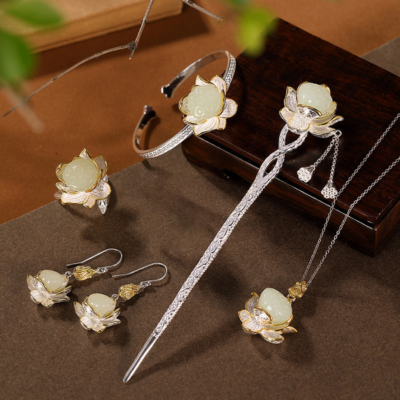 天然和田玉S925纯银镀金蓬莲花耳环戒指吊坠发簪女款套装