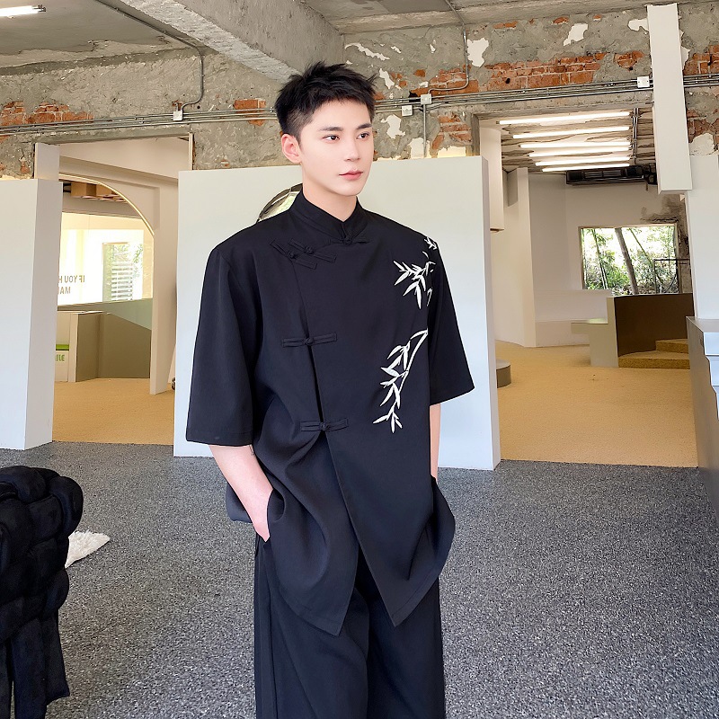夏季改良新中式盘扣衬衫男短袖小众竹子刺绣设计感复古中国风衬衣