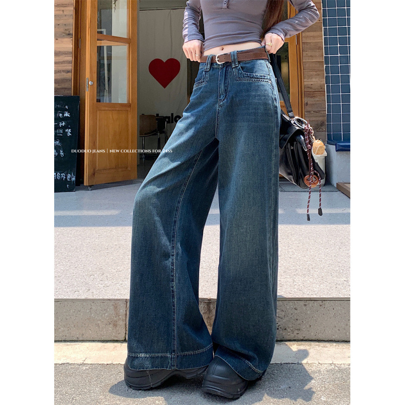 美式复古水洗阔腿牛仔裤女新款高腰宽松直筒拖地长裤女