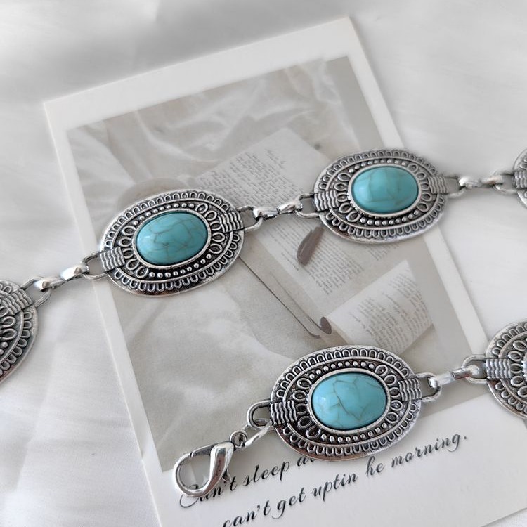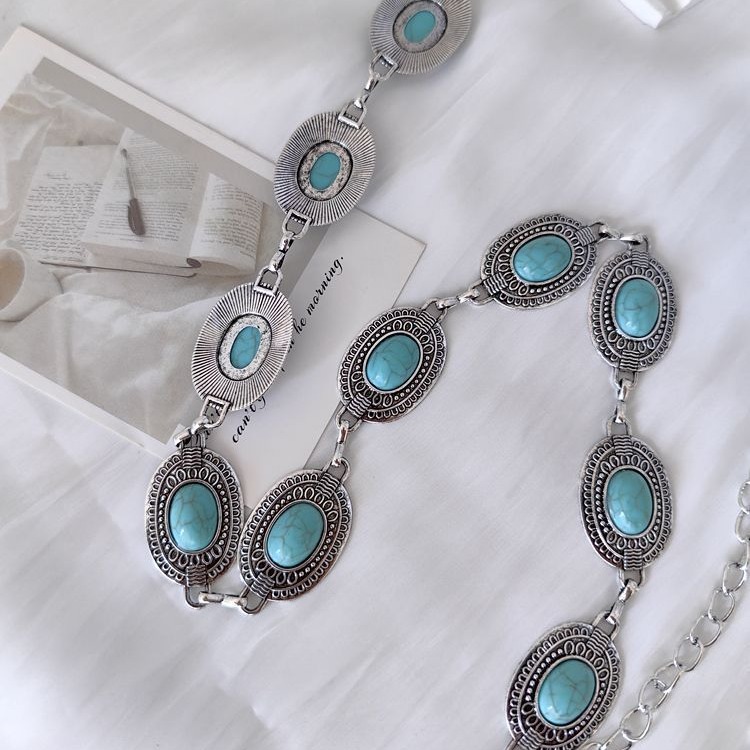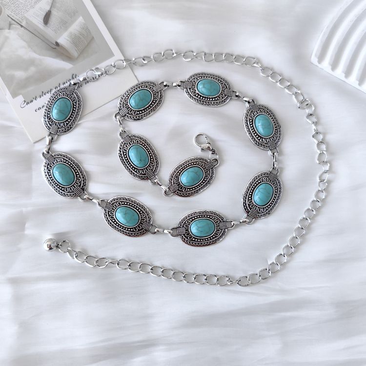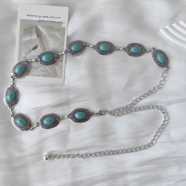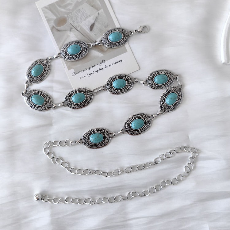 椭圆绿松石复古腰链女装饰夏季民族风配连衣裙金属腰带辣妹身体链