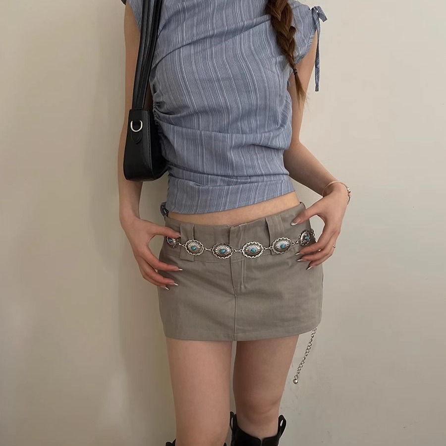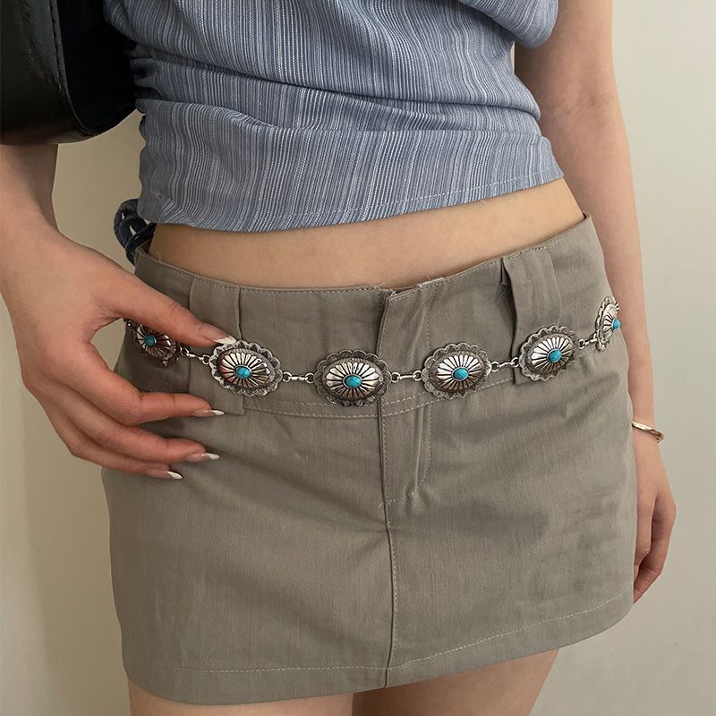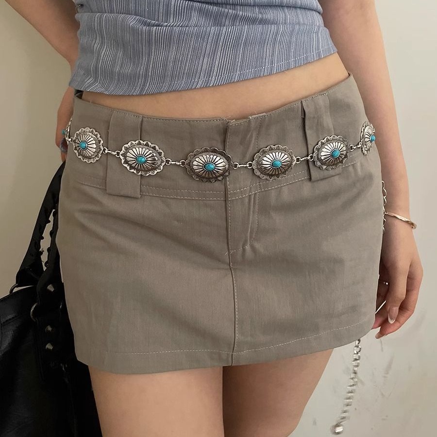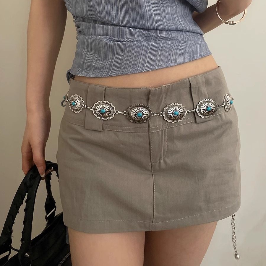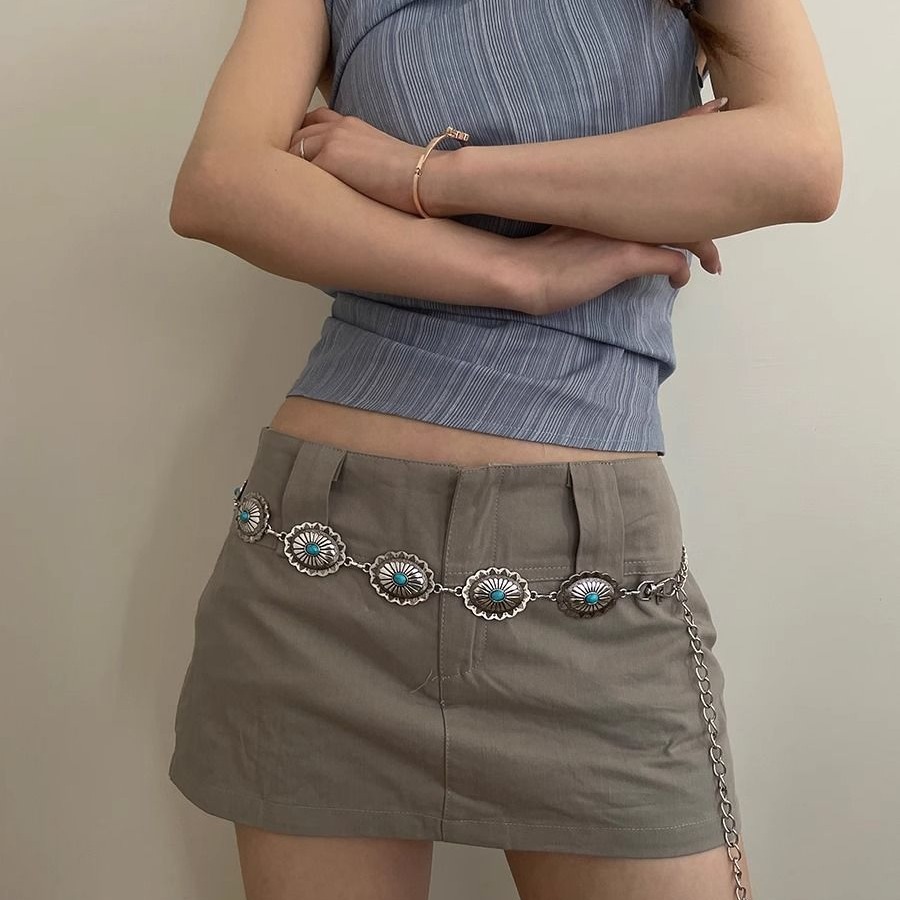 复古做旧民族风腰链女金属压花蓝色镶嵌设计配裙子牛仔裤百搭腰带