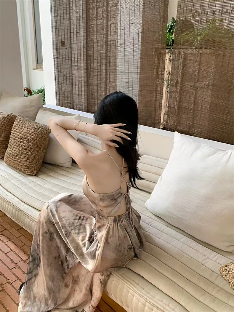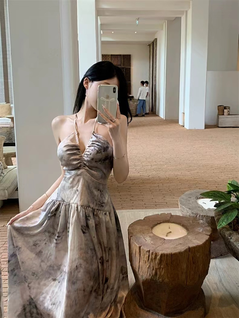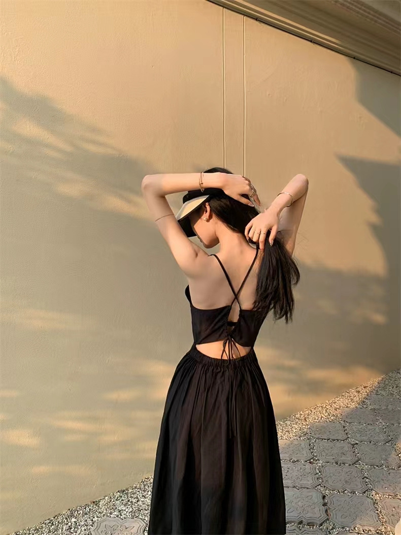 海边小众设计感镂空露背挂脖吊带连衣裙女夏v领气质度假沙滩长裙