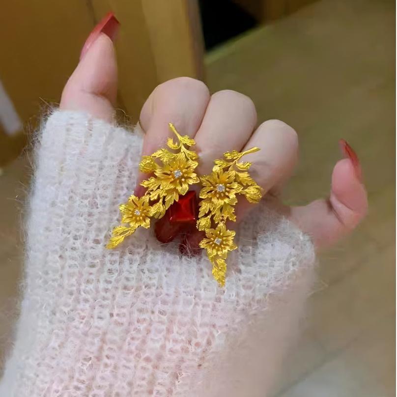 小红书同款一花一叶耳饰女古法黄金色树枝元素时尚个性耳坠首饰品