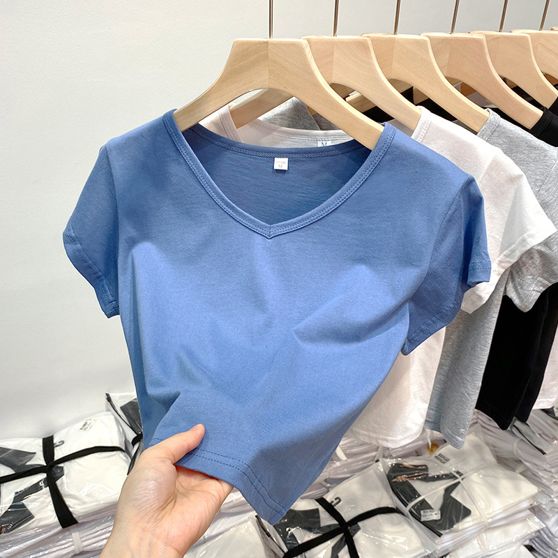 正肩短袖t恤女夏新款甜辣妹小个子高腰短款紧身纯色v领上衣服