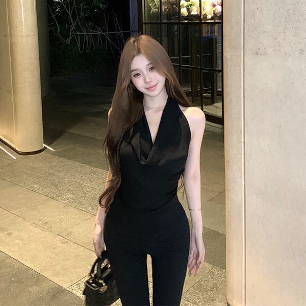 泰国 东南亚 韩版挂脖上衣背心女新款白色无袖辣妹穿搭设计感短款