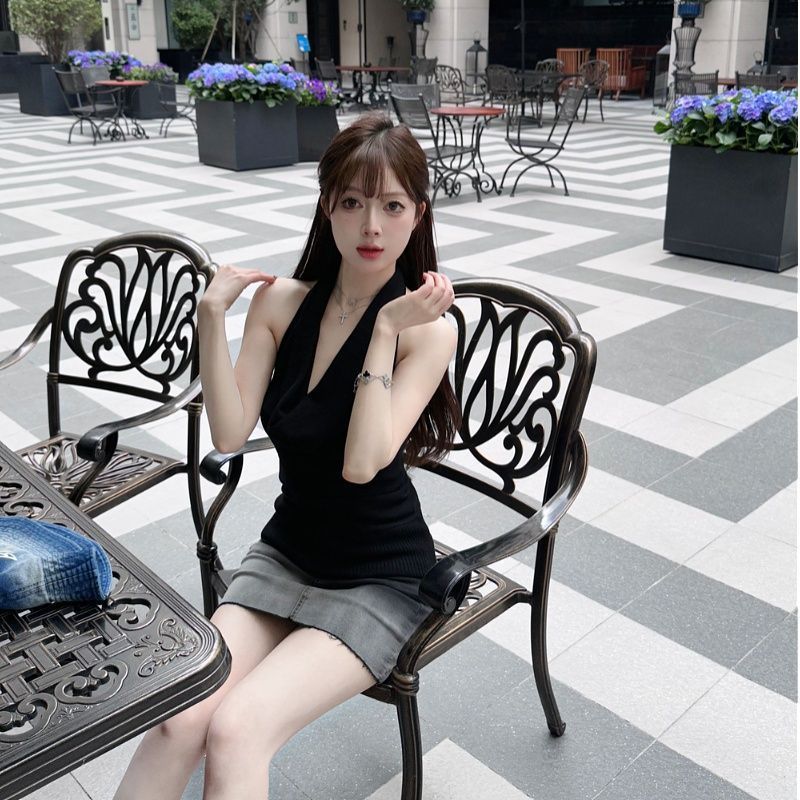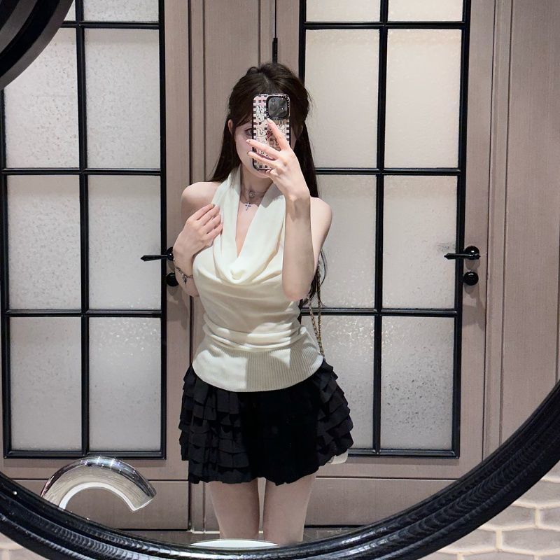 【全网低价】韩版挂脖上衣背心女新款白色无袖辣妹穿搭设计感短款