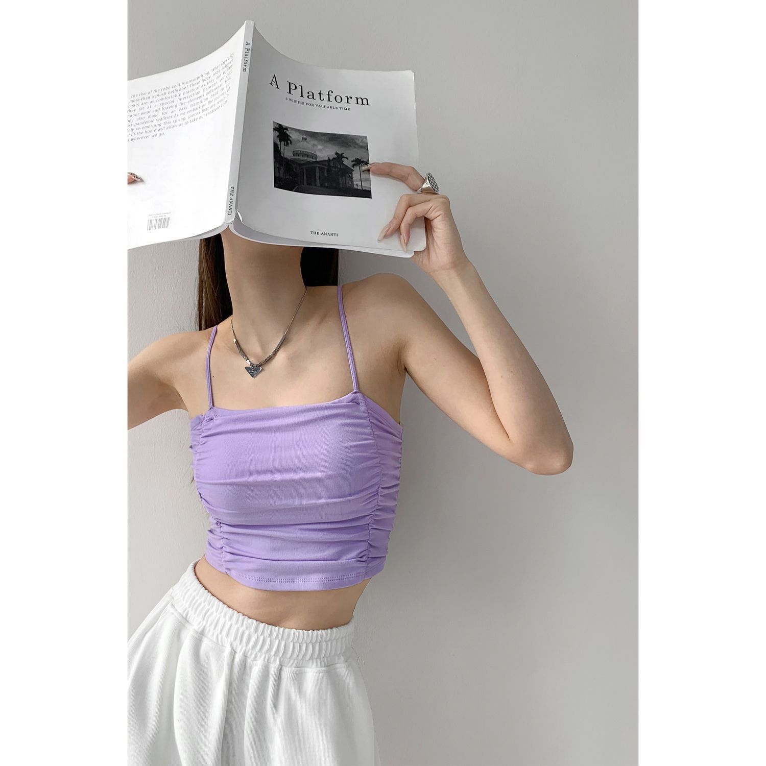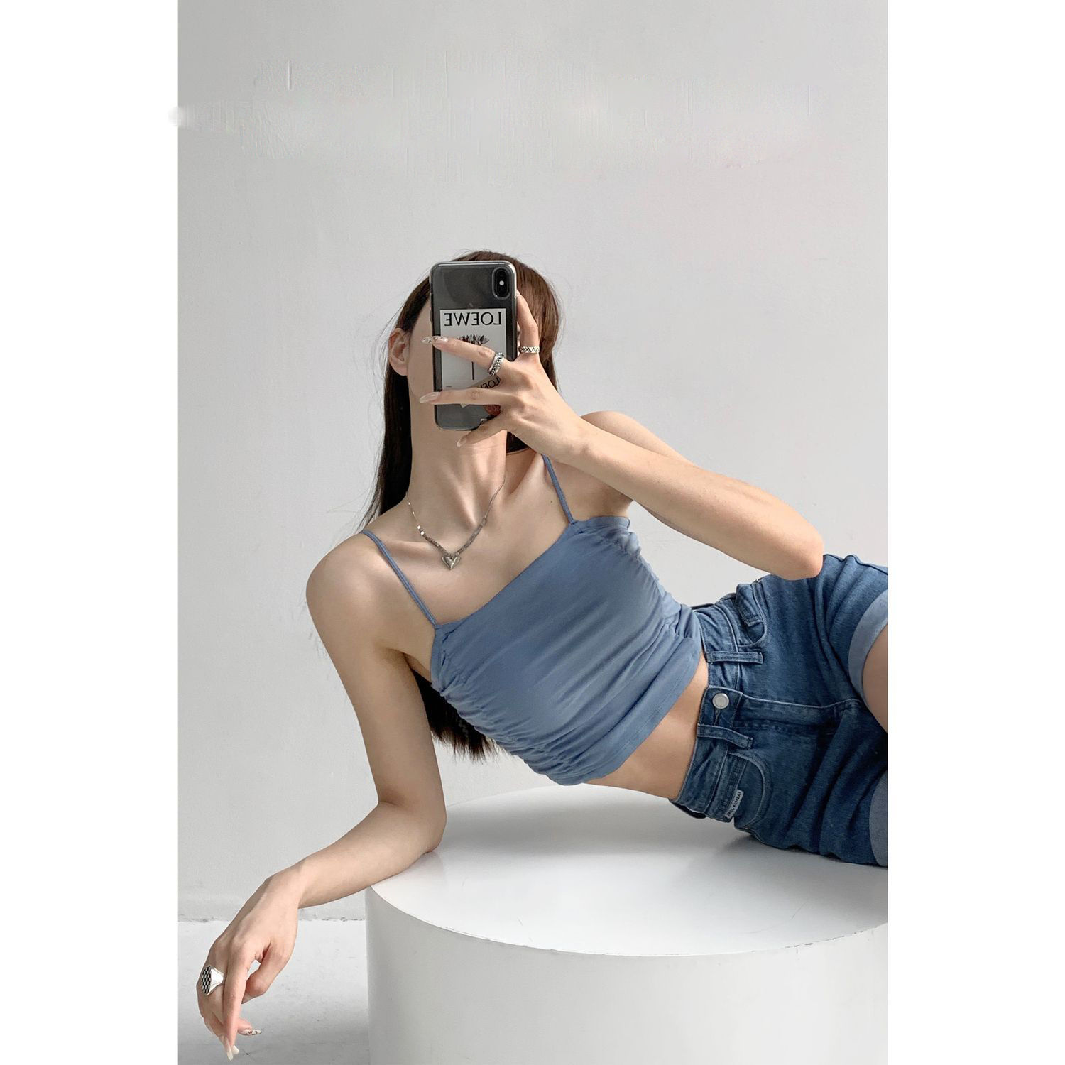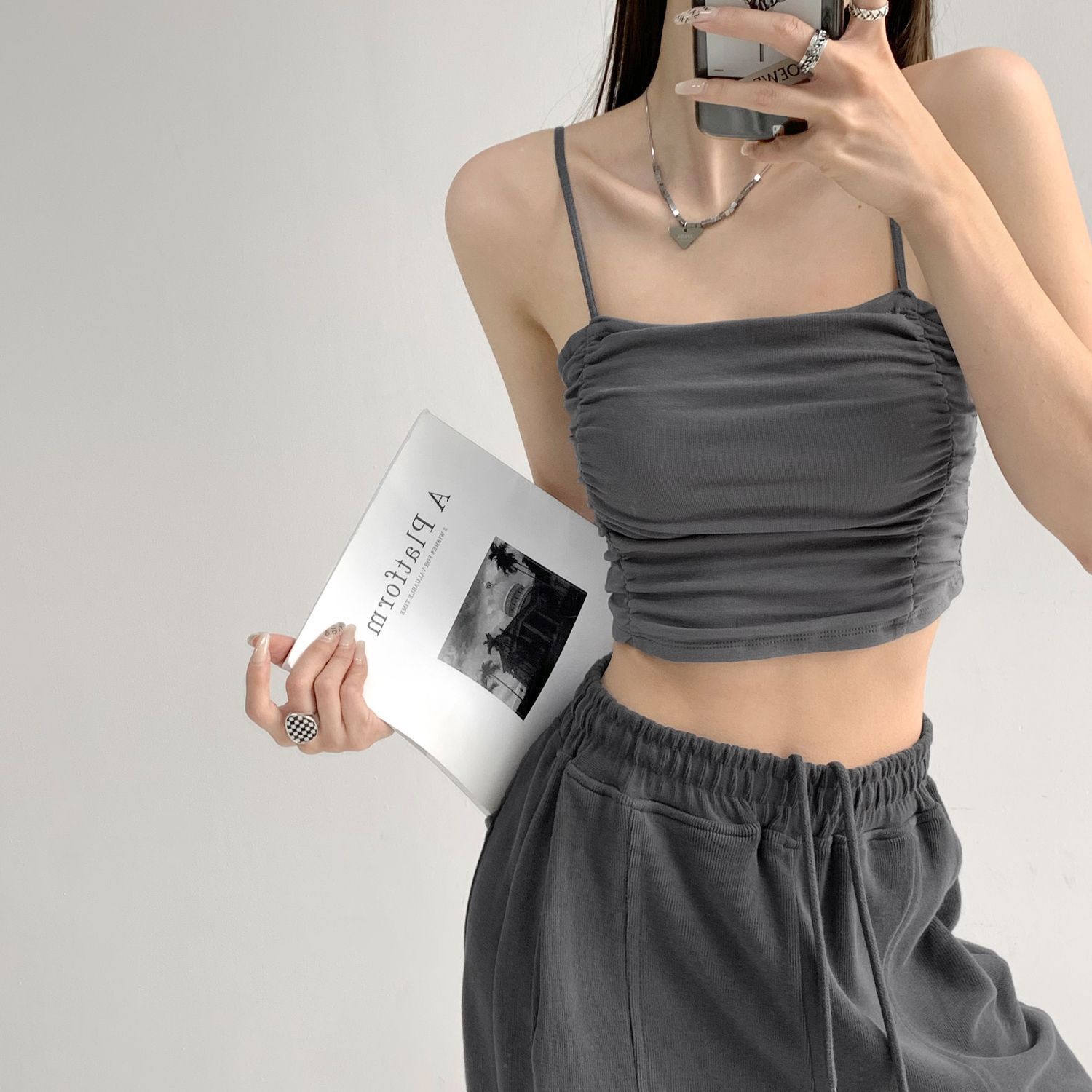 纯欲褶皱小吊带背心女夏季短款辣妹修身露脐纯色上衣