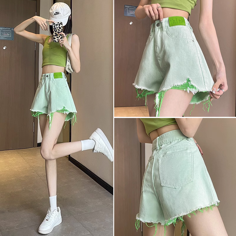 浅绿色破洞牛仔短裤女夏季薄款新款高腰小个子宽松阔腿热裤