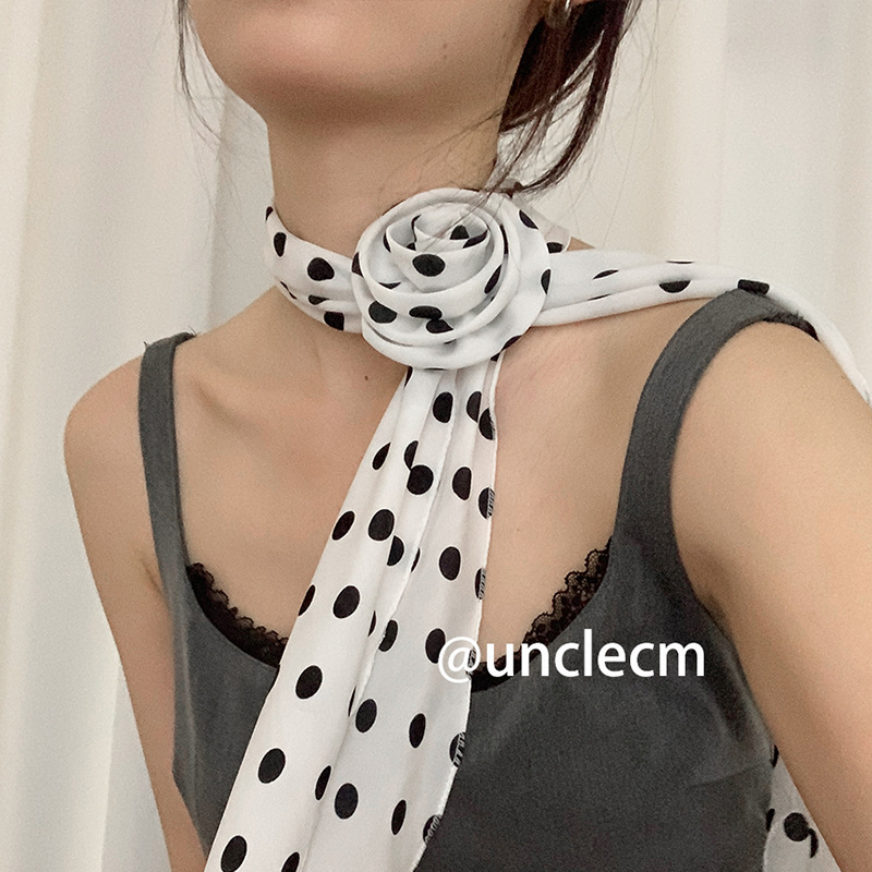 高级感丝巾女长条波点设计感新款玫瑰花围脖飘带百搭系脖黑色