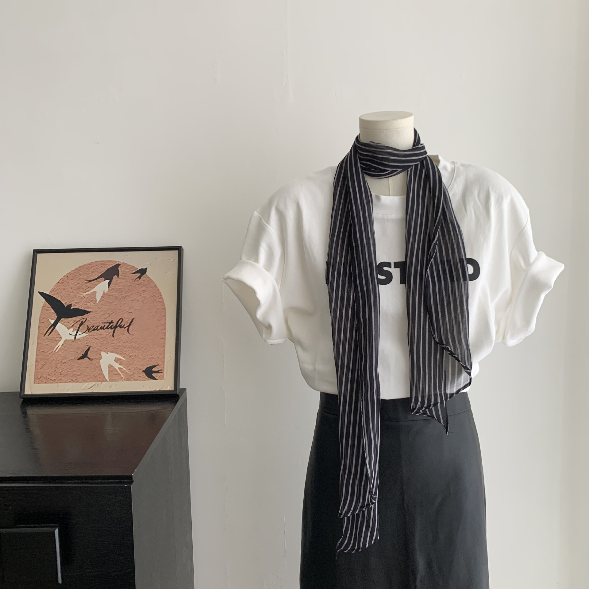 日系简约黑白条纹丝巾复古文艺纱巾百搭窄版细条围巾韩系薄款丝带