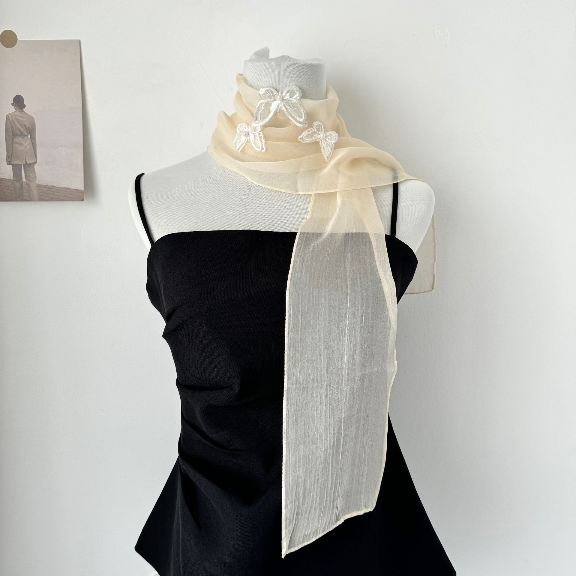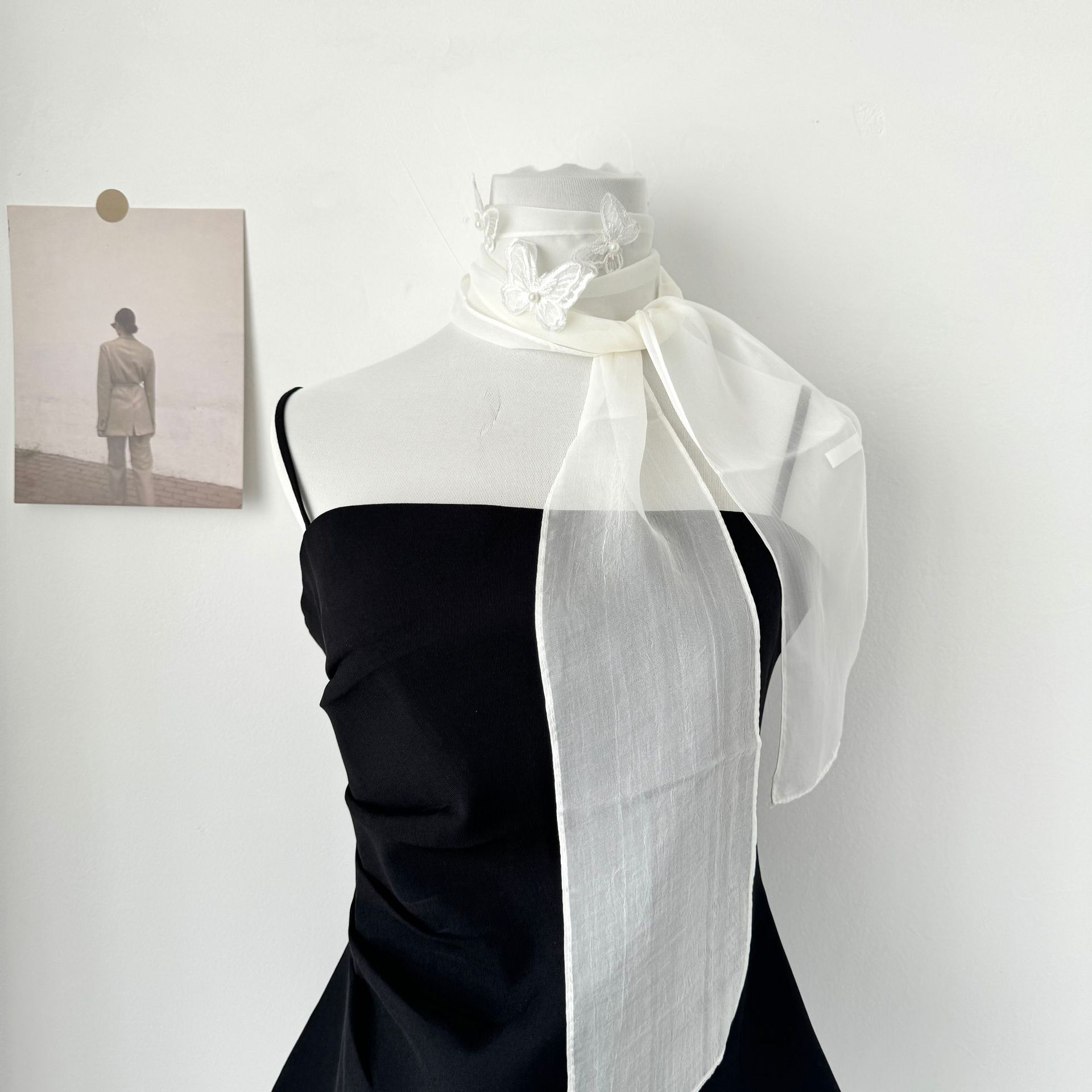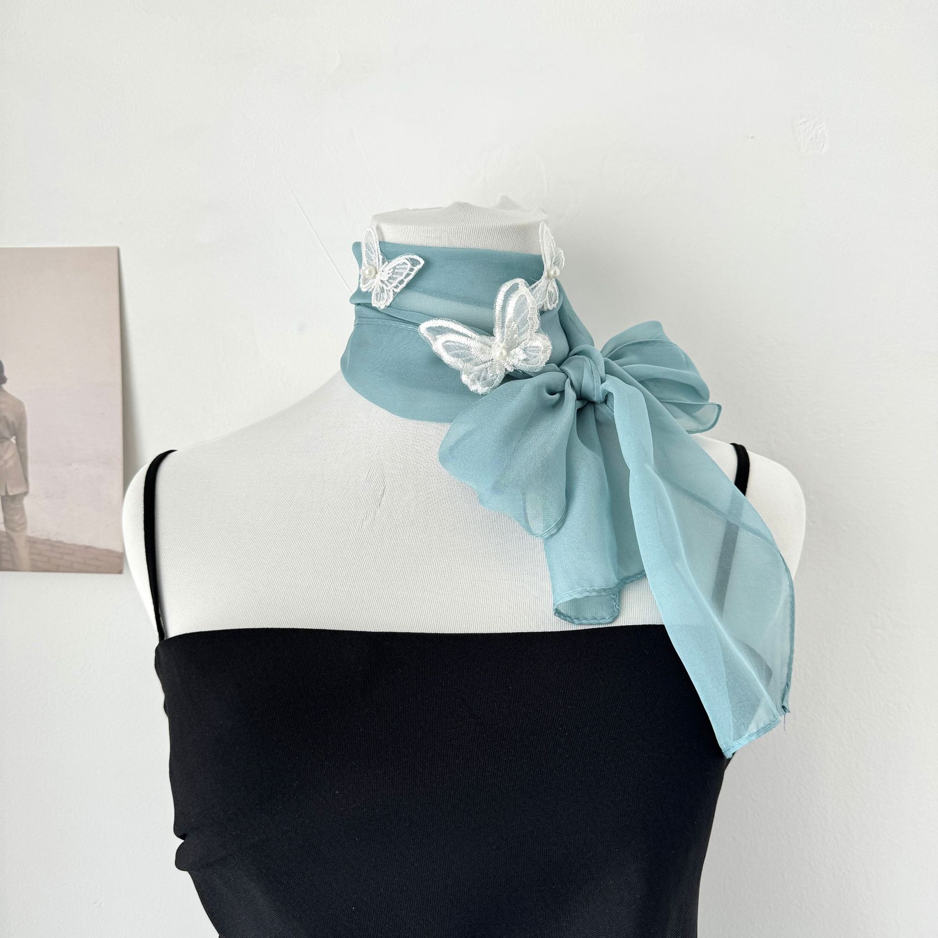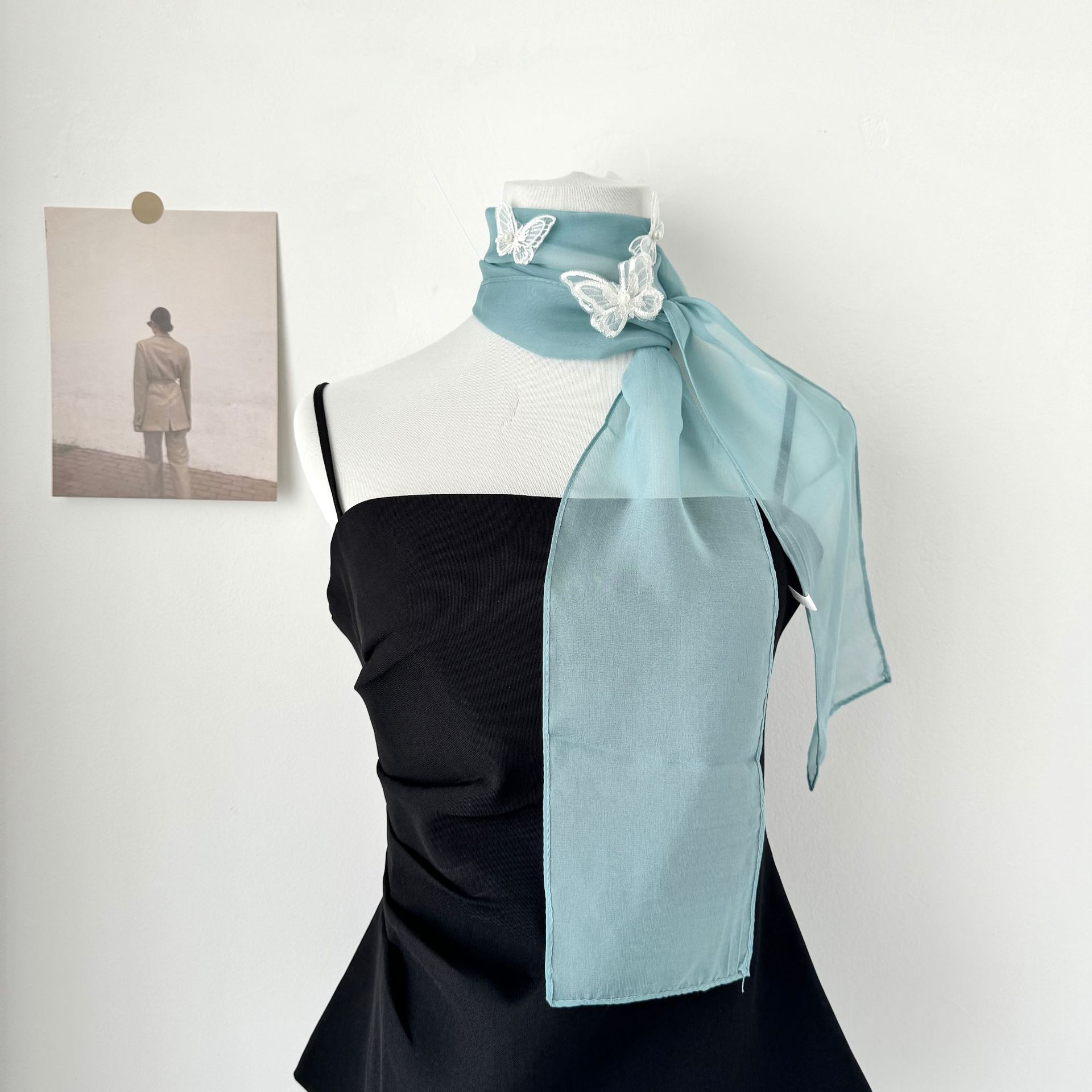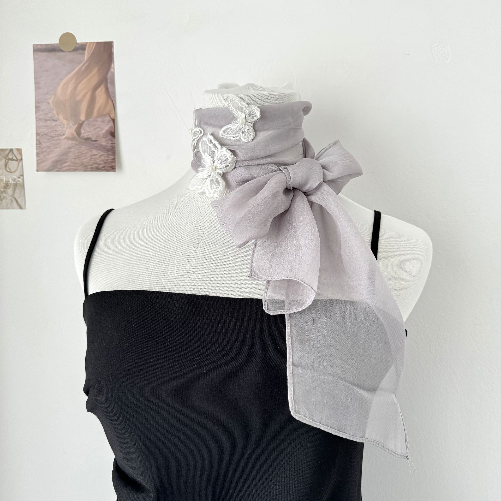 韩国ins 新款时髦小众原创设计法式蝴蝶长条小丝巾纯色飘带发带女