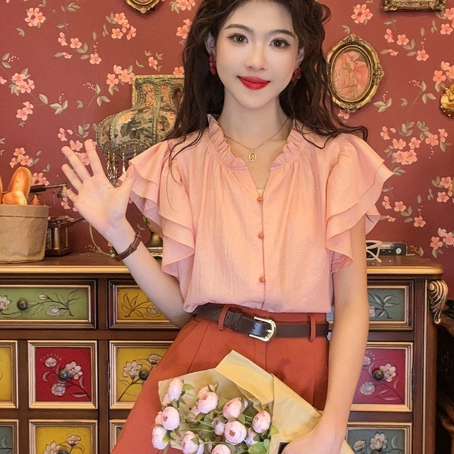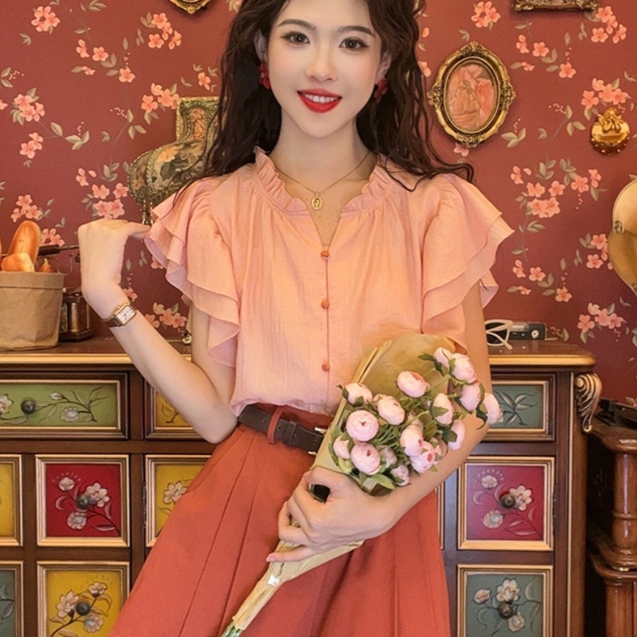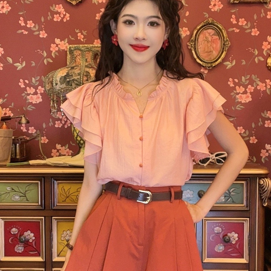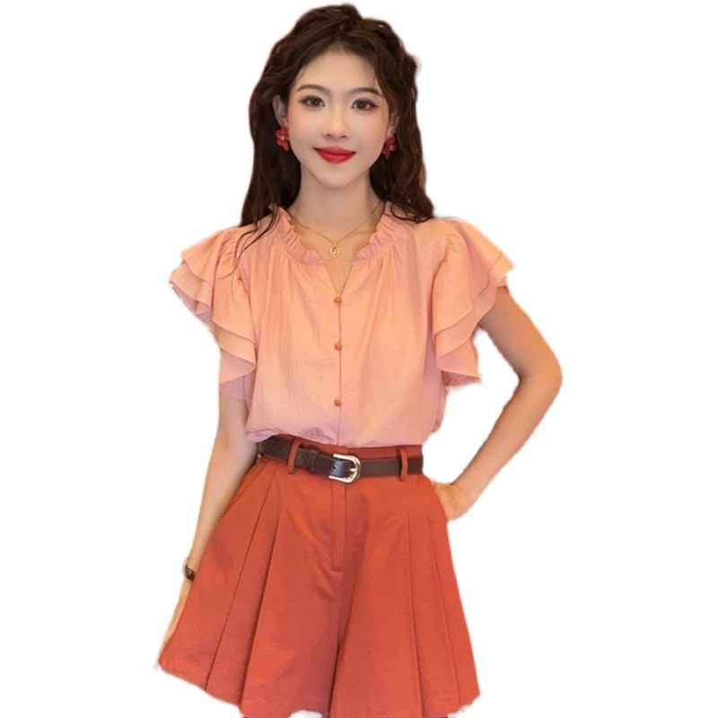 夏日港风复古套装女法式高级感温柔风飞飞袖衬衫橘色短裤两件套