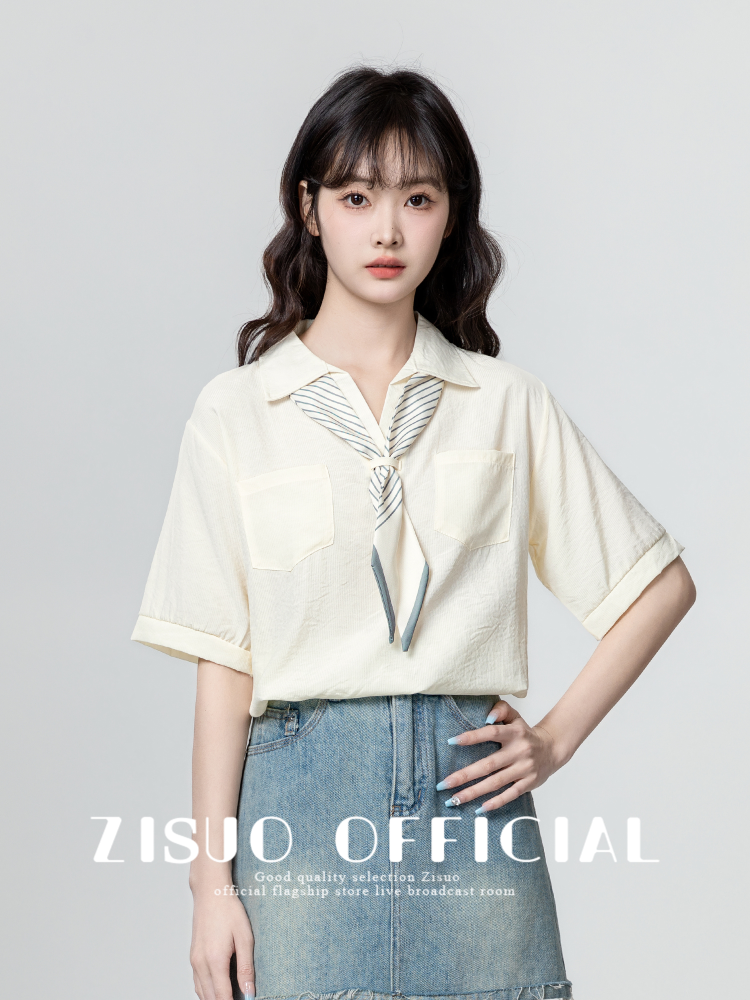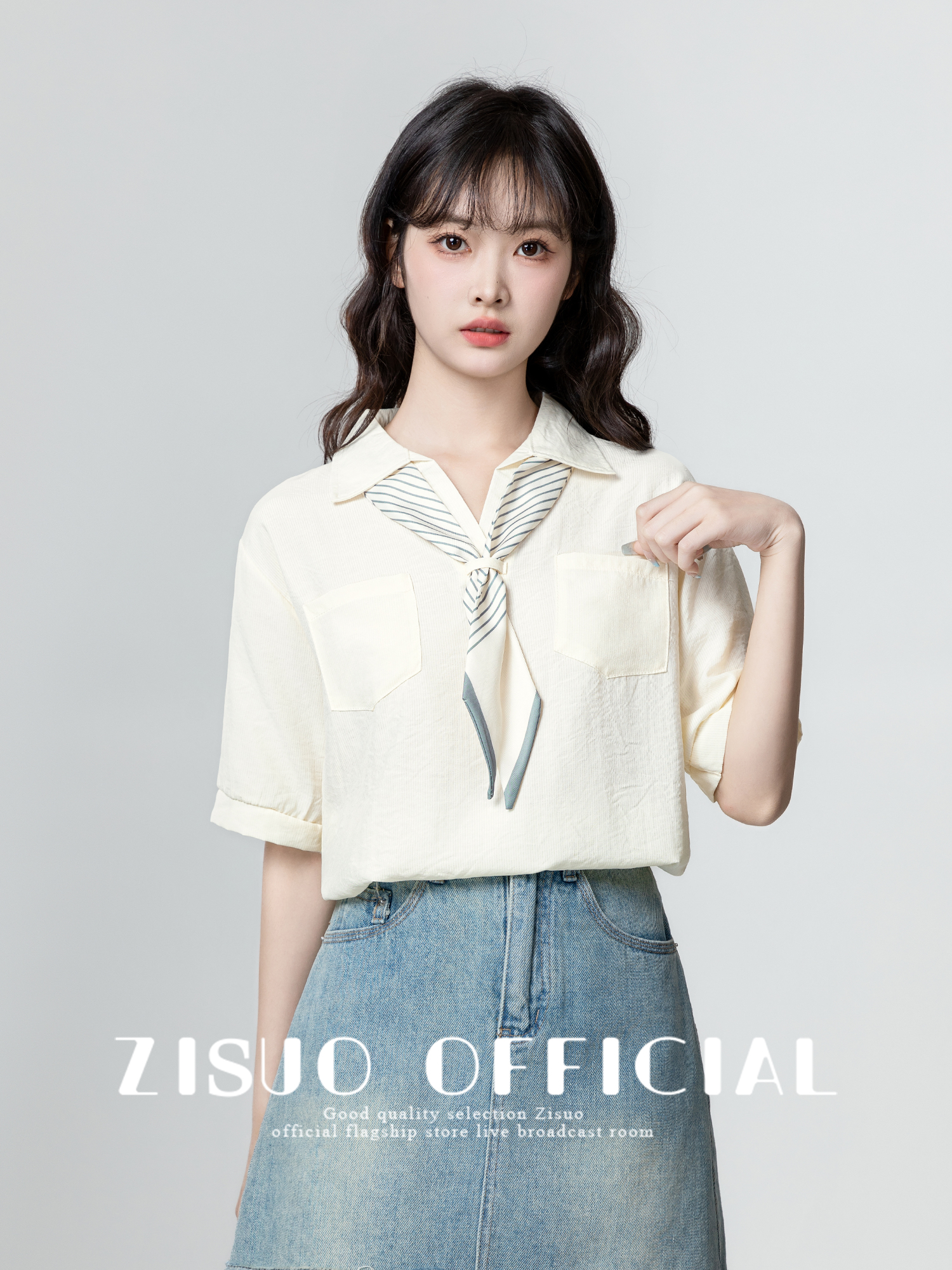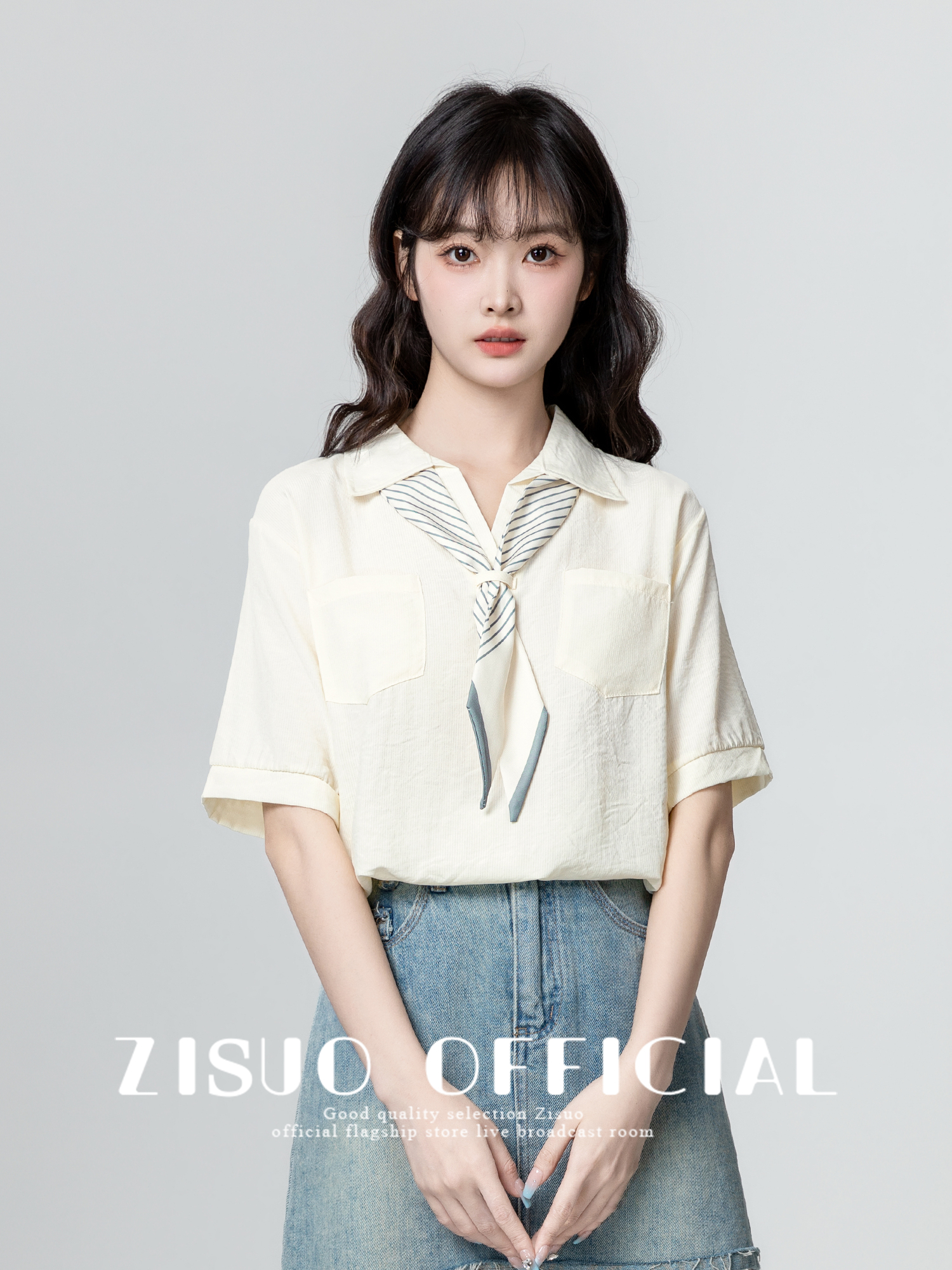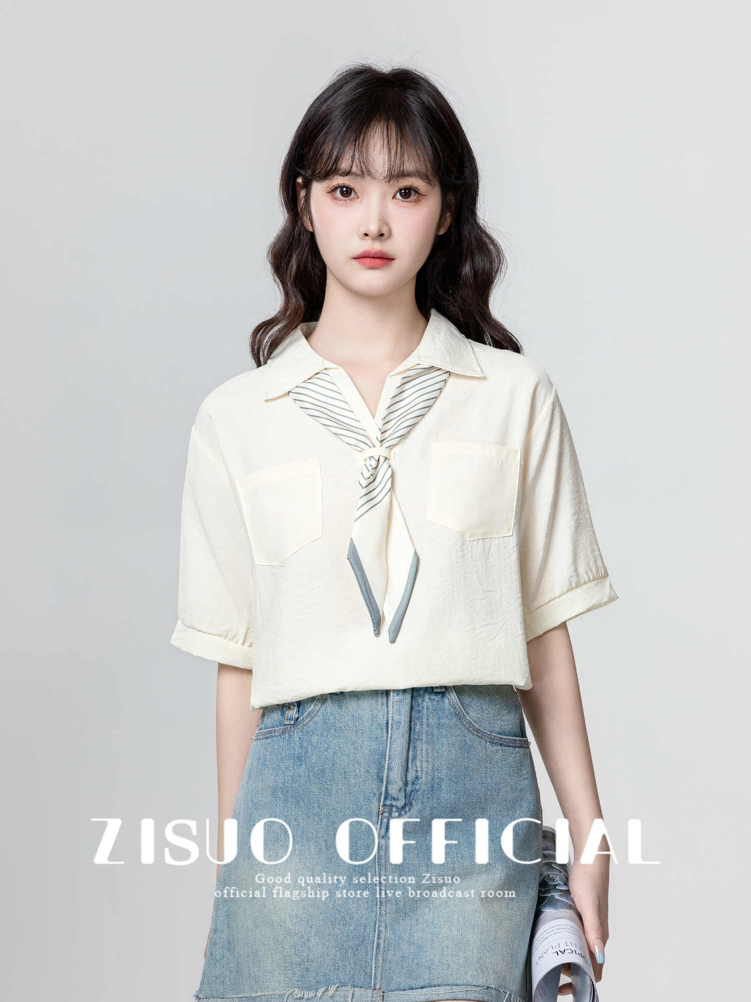 杏色短袖衬衫女2025夏季新款带领带polo领衬衣宽松设计感小众上衣