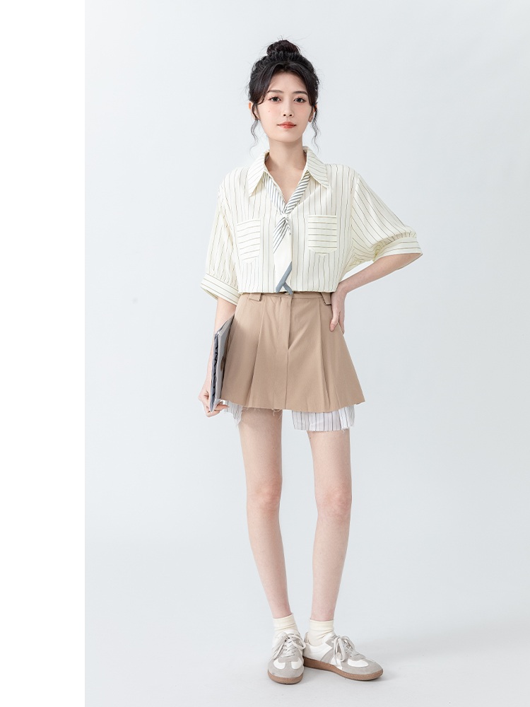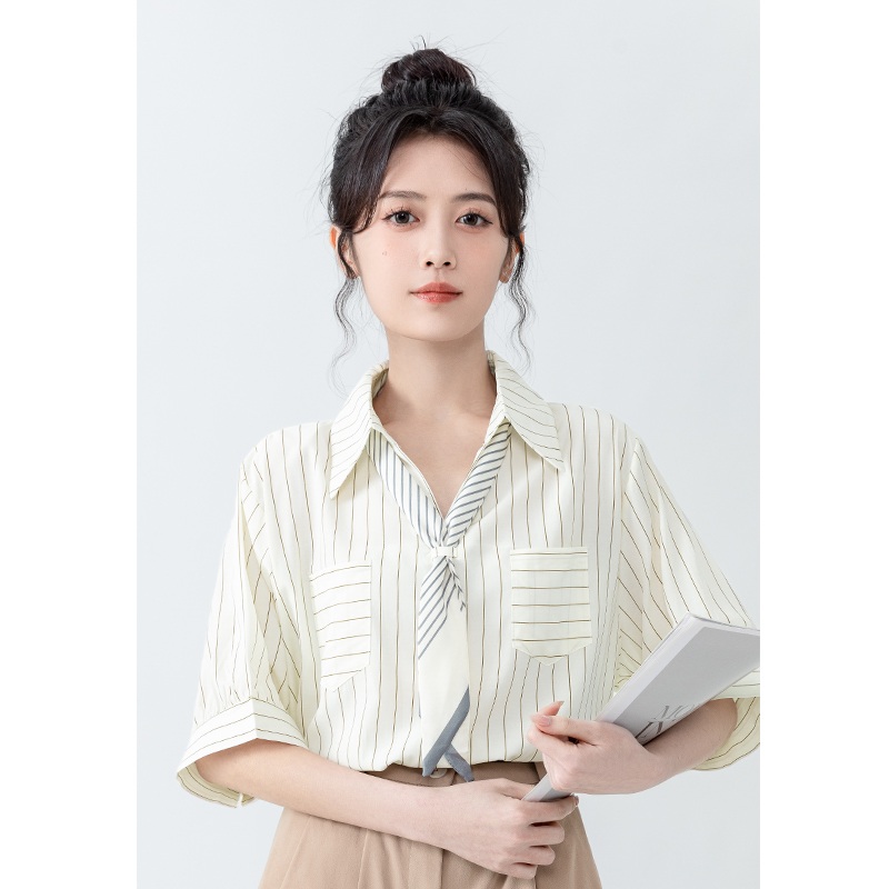 法式条纹领短袖衬衫女夏新款2025领带领结衬衣正肩半袖上衣