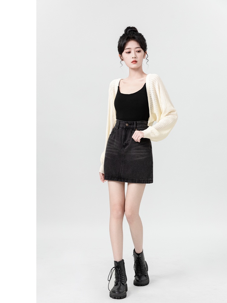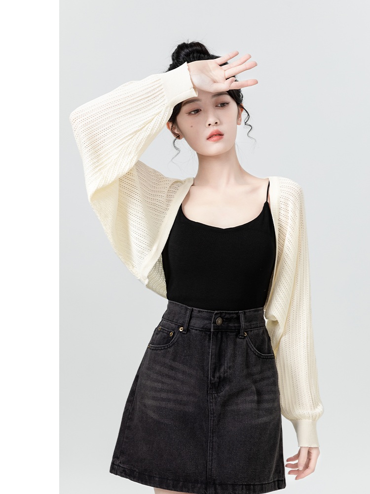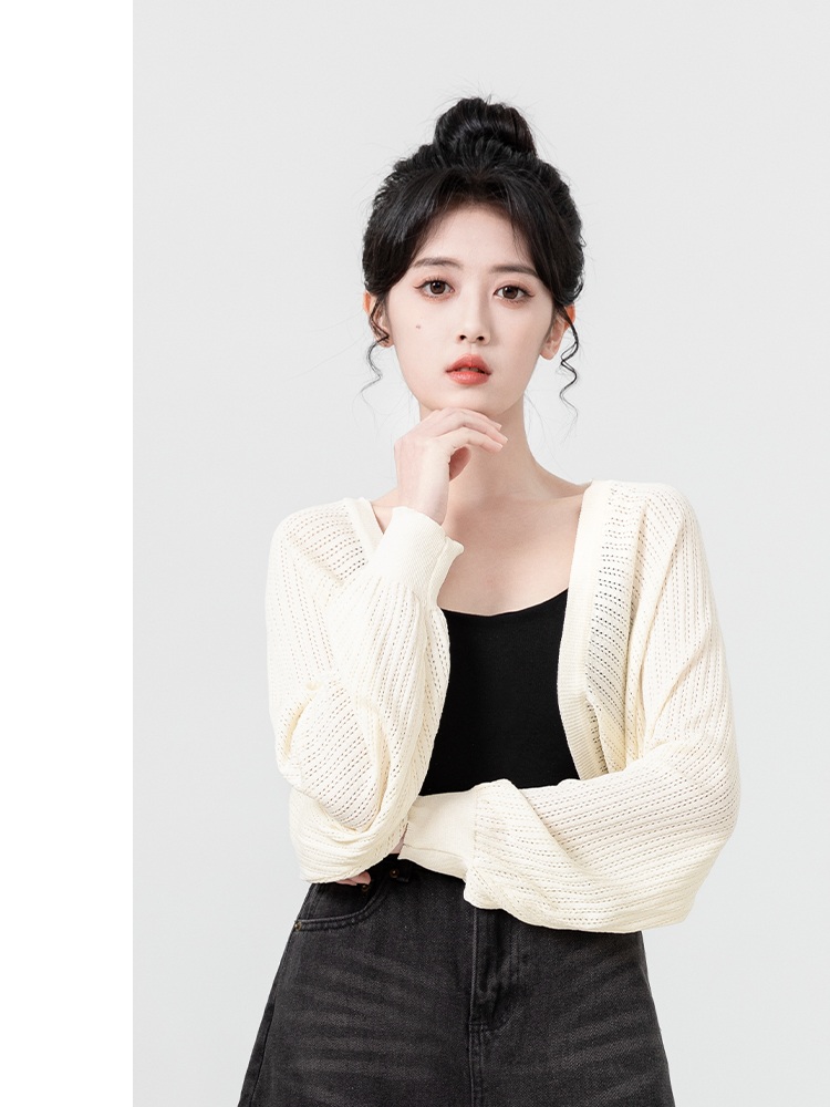 杏色镂空长袖针织开衫女夏2025新款防晒罩衫吊带外搭短款坎肩上衣